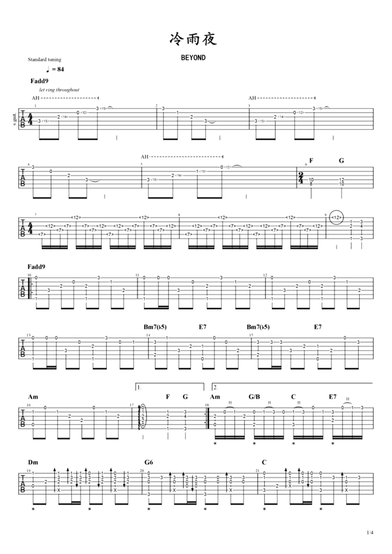 冷雨夜吉他谱 - Beyond - 吉他独奏谱