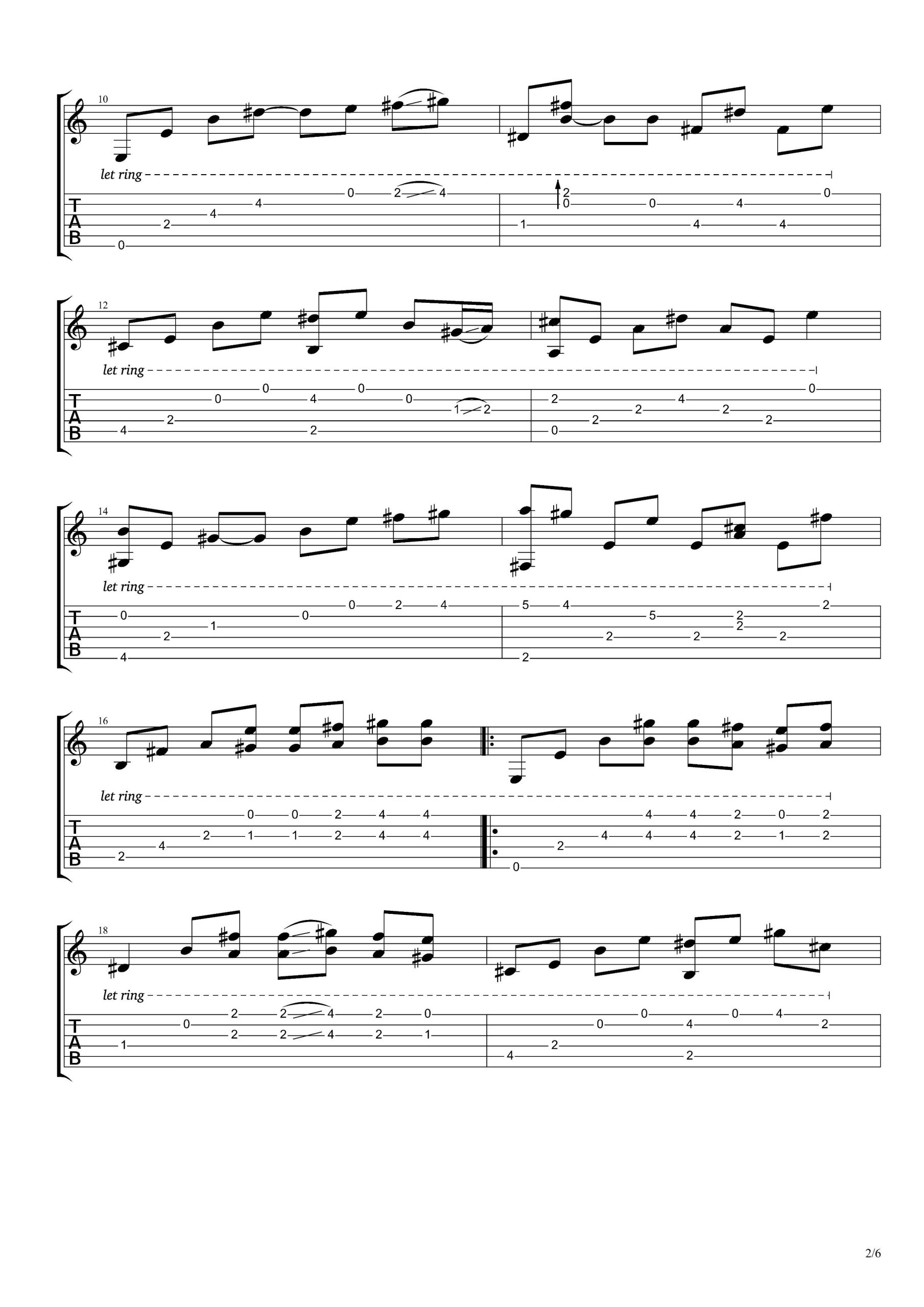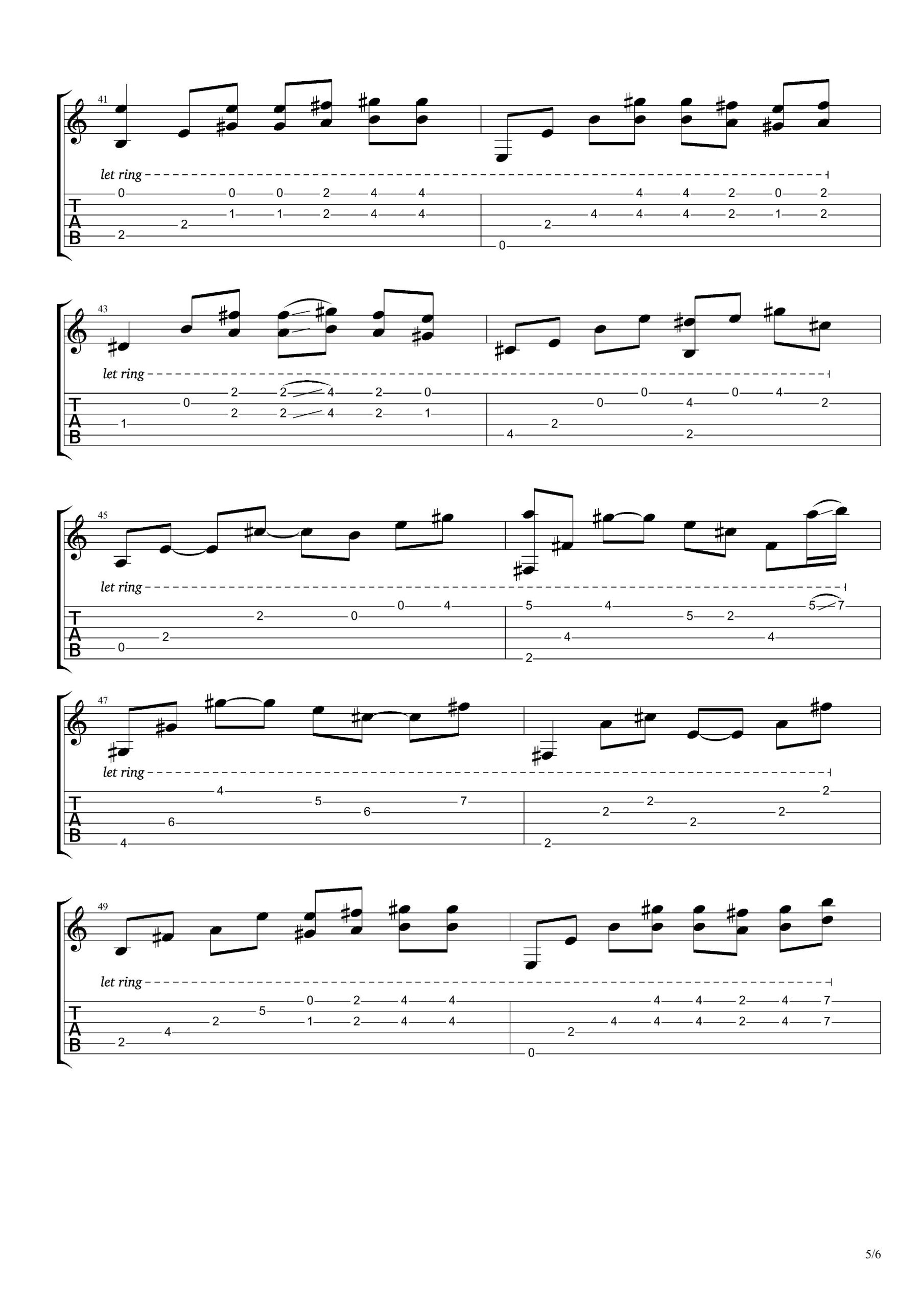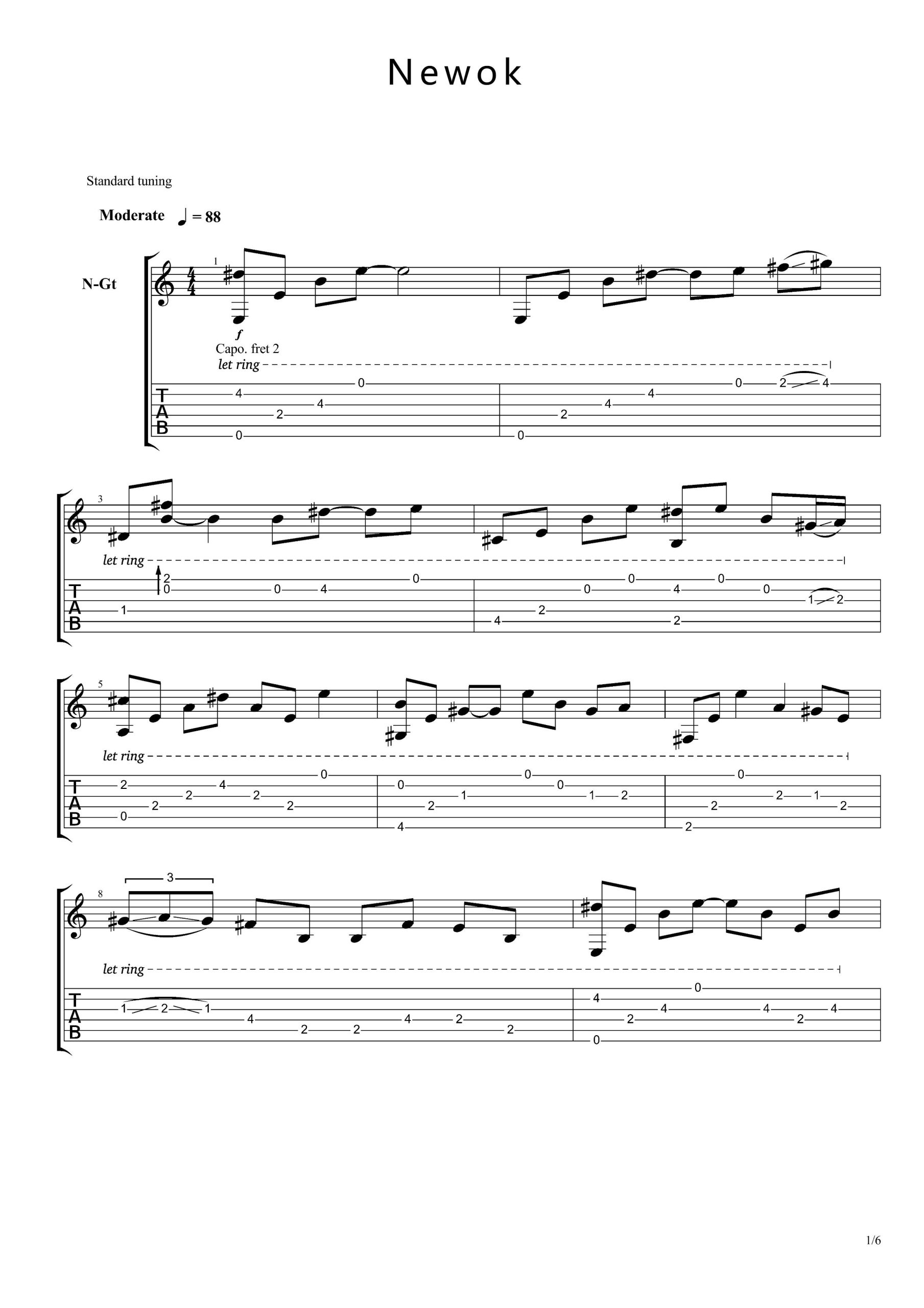 曲谱介绍: Newok指弹谱,黄家伟独奏版本,非常舒缓温暖的一首曲子,静静聆听,治愈人心,让我们在曲折的岁月里感到一丝美好的希望,充满着憧憬。 《Newok》指弹吉他谱,共6张高清图片谱,速度控制在88拍每分钟,节奏4/4拍,指弹难度2级较简单。 指弹谱详情