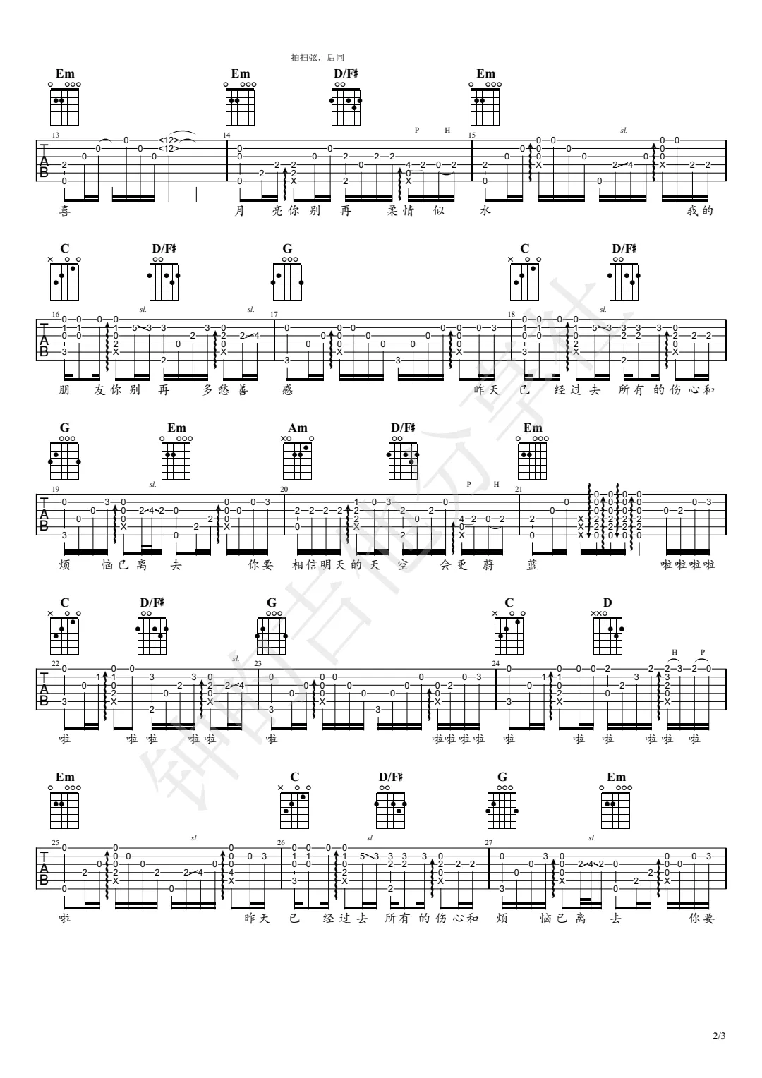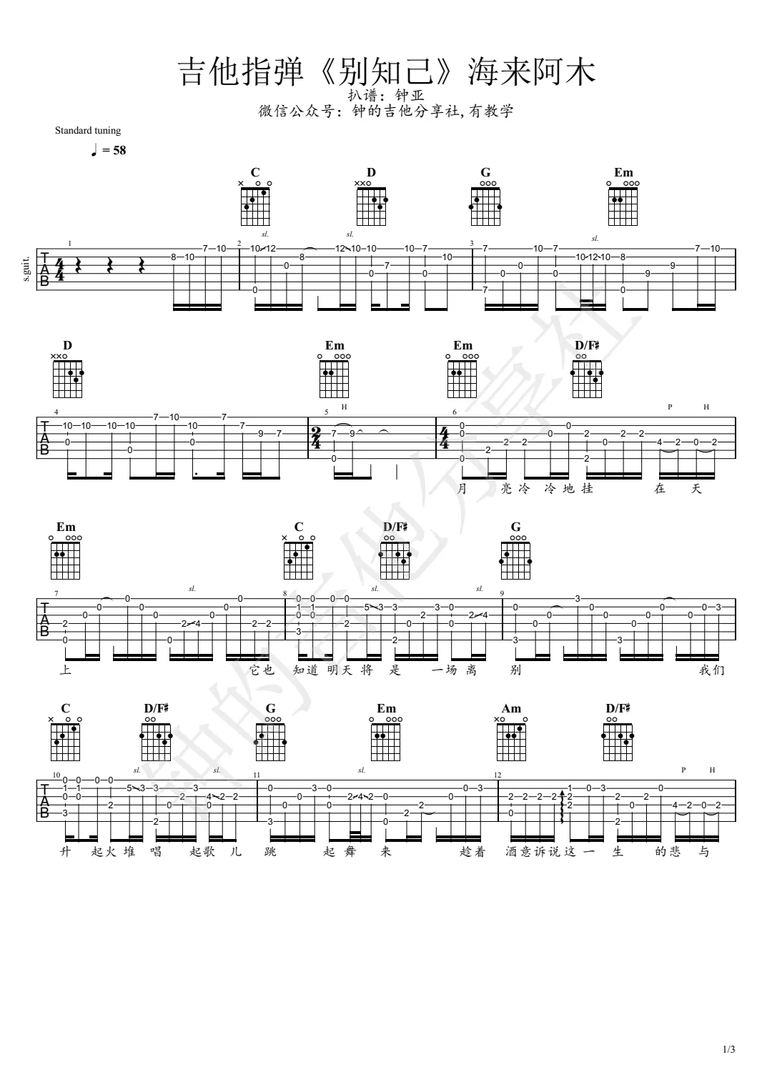 曲谱介绍: 吉他谱介绍:别知己指弹吉他谱,海来阿木的一首指弹吉他曲目,这首曲子采用的是标准调弦,4/4拍的节奏,无需特殊调音。演奏时可不夹变调夹,曲谱由琴谱网更新上传,共3张高清图片指弹吉他谱例,来源于@钟亚编配出品。这首歌来自海来阿木,根据原曲改编的指弹吉他曲,指法比较简单,整体难度适中。 别知己指弹吉他教学