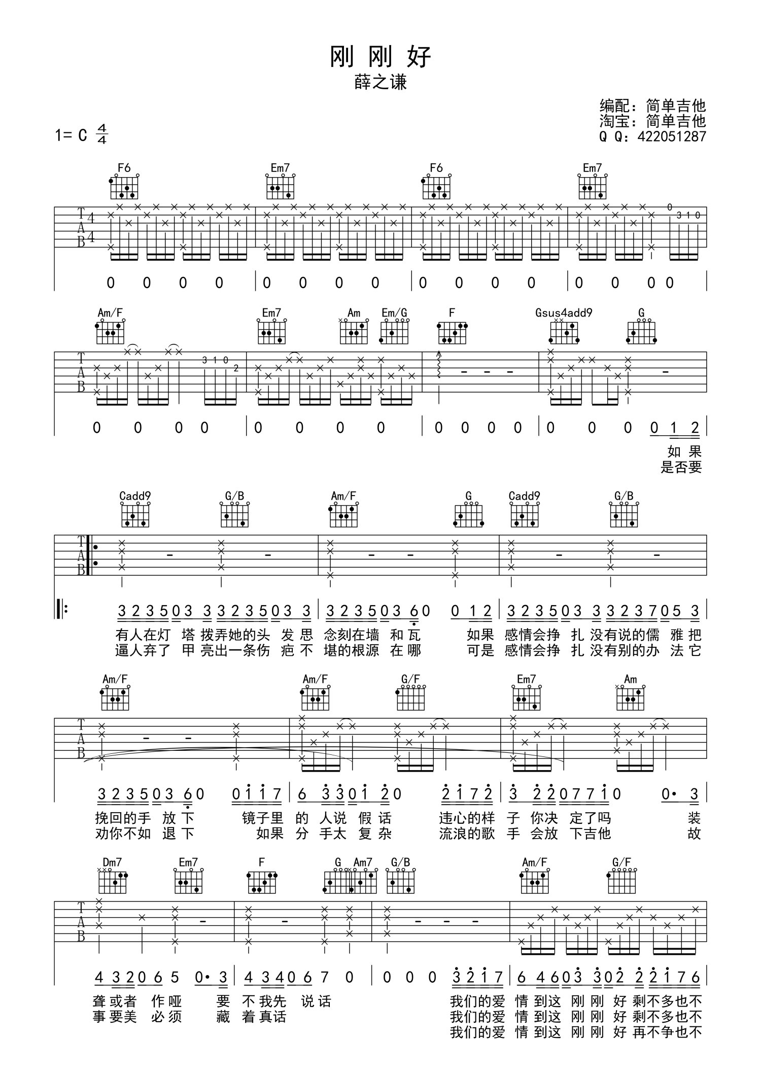刚刚好吉他谱 - 薛之谦 - C调吉他弹唱谱