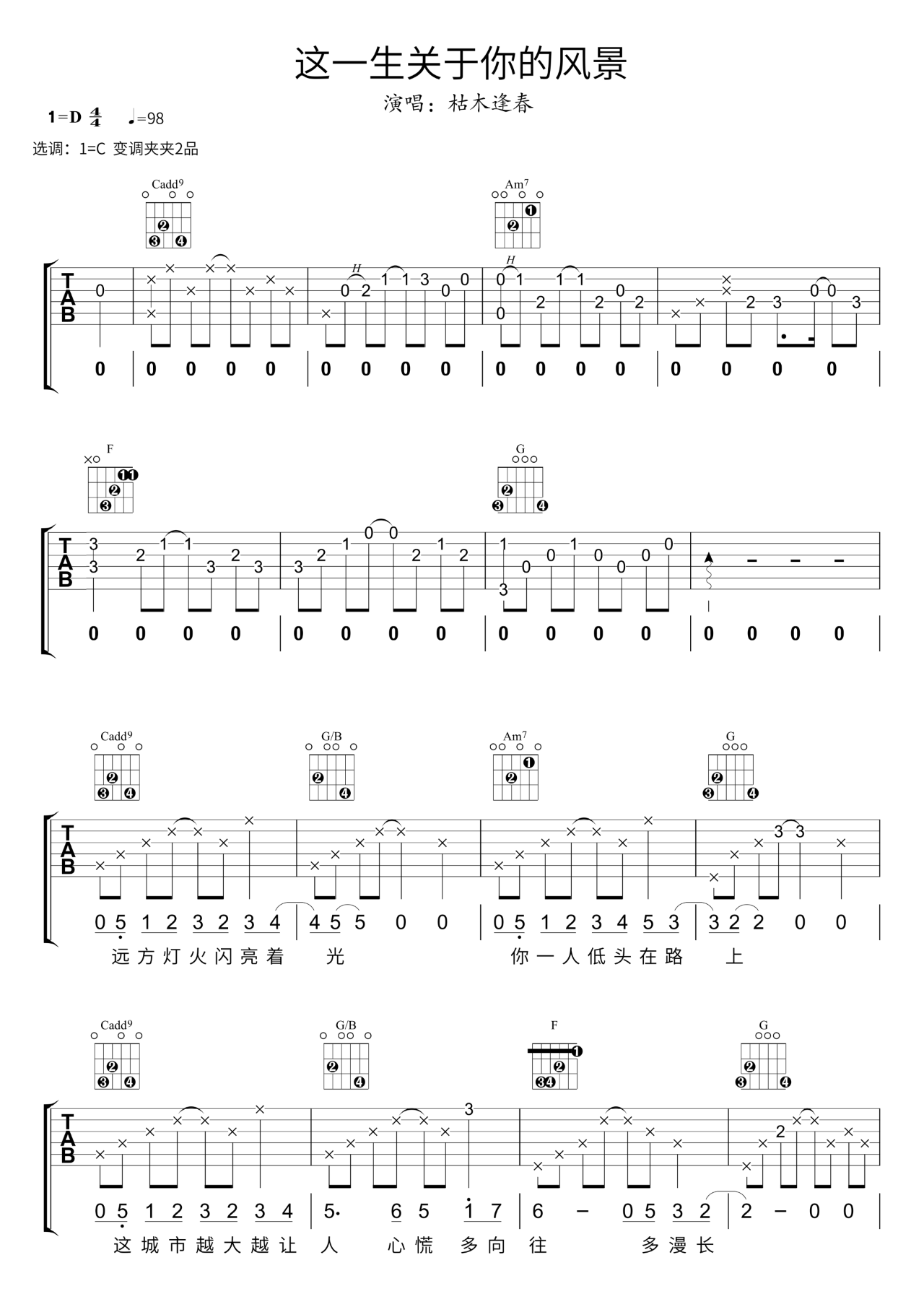 曲谱介绍: 这一生关于你的风景吉他谱,枯木逢春演唱的一首感人情歌,选用C调指法,原调D调,标准调音CAPO推荐2品弹唱,节奏4/4拍,速度控制在98拍每分钟,随谱附弹唱音频演示可供大家参照。