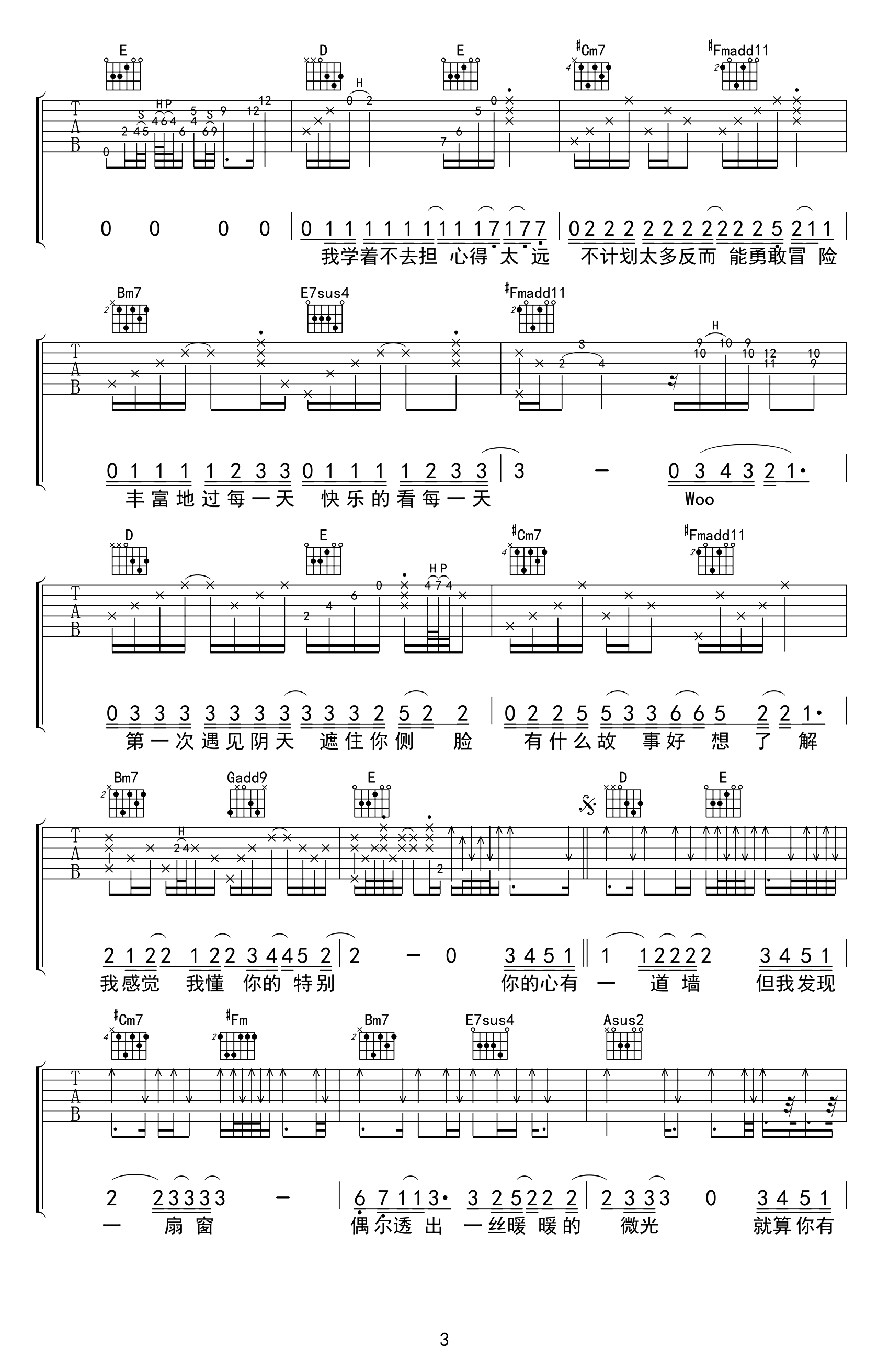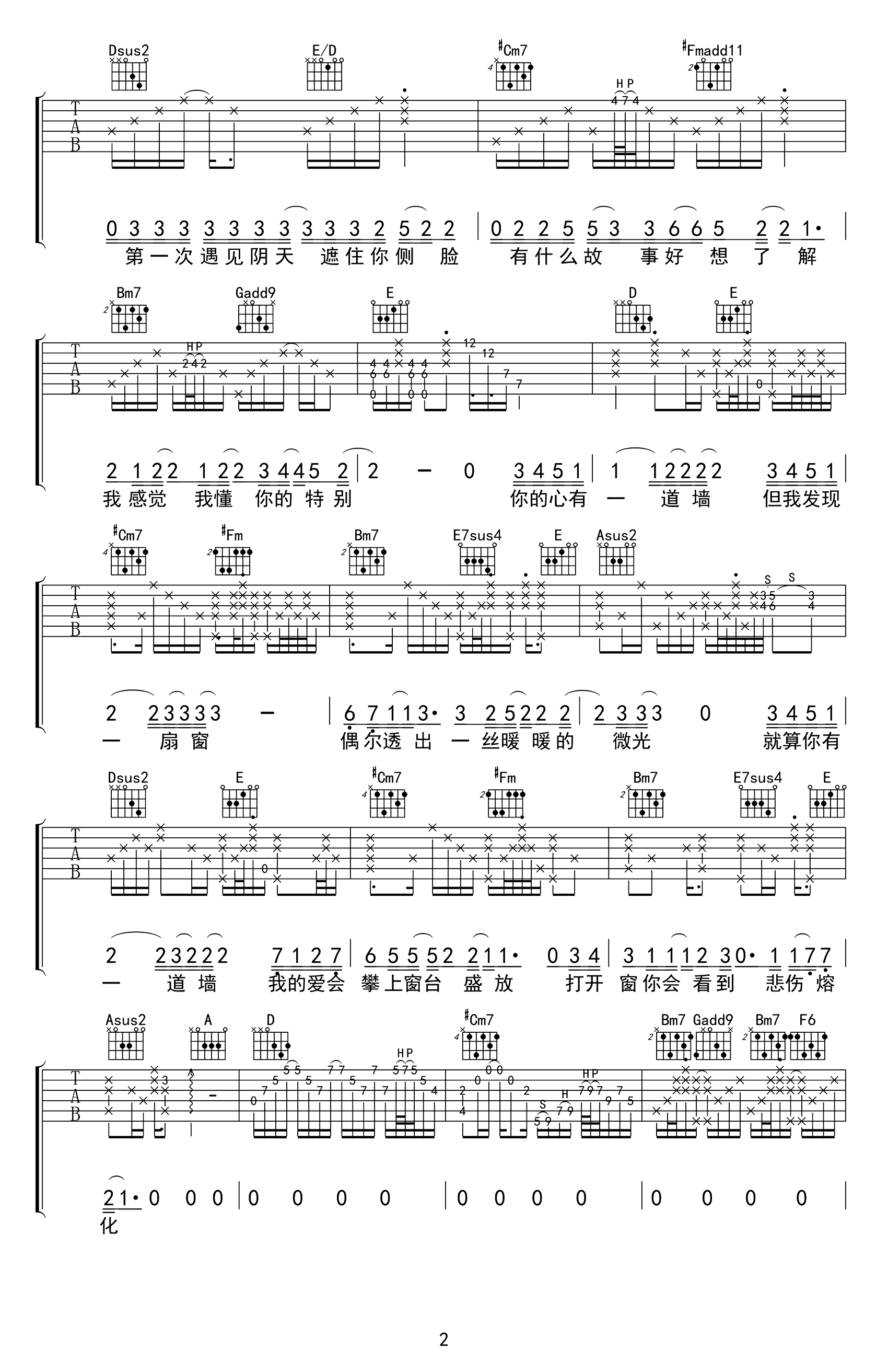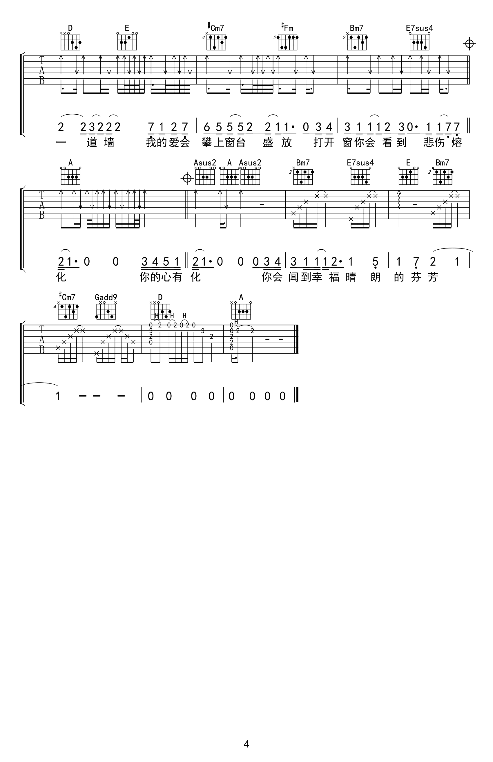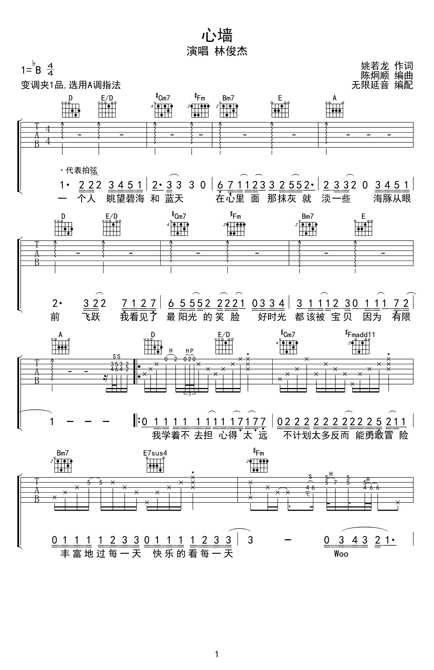 曲谱介绍: 心墙吉他谱,是郭静最具代表性的作品,林俊杰为此创作作曲并演唱了男声版本,细腻温婉的曲风经久耐听,这首歌以心墙为喻,阐述了小女生在爱情中得失的挣扎,如“心墙”一般,看似困境之中却透出小情歌的舒适感,清新略带甜味的风格如微风一般拂过,恬静得恰到好处,好似能在这清澈的声音得到灵魂的治愈。 《心墙》吉他六线谱,共有四张高清PNG图片谱,选用A调指法,原调bB,变调夹建议夹1品弹唱原调,节奏4/4拍,本曲编配的细节较多,适合中级水平弹唱。