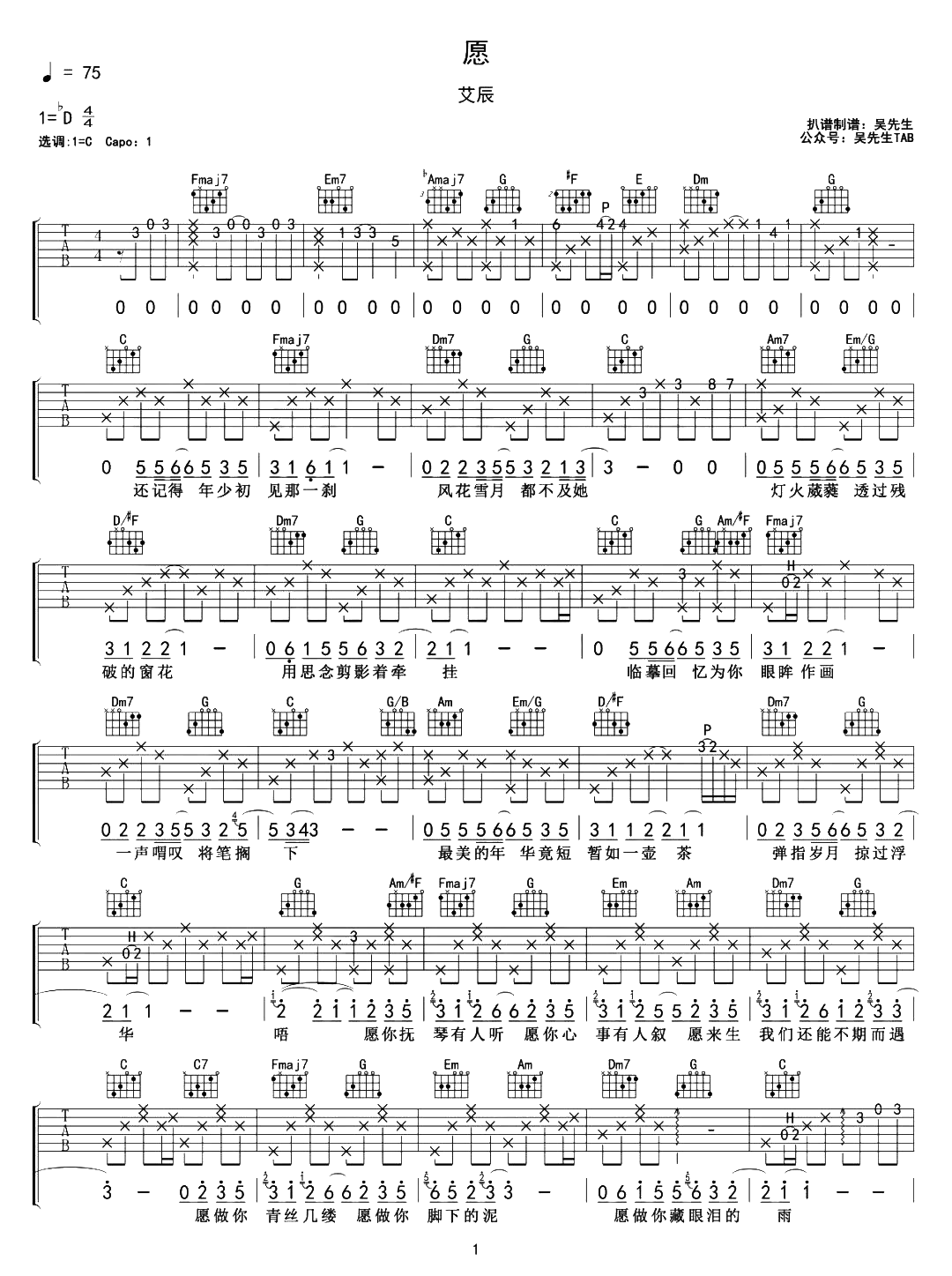 愿吉他谱 - 艾辰 - C调吉他弹唱谱 - 原版
