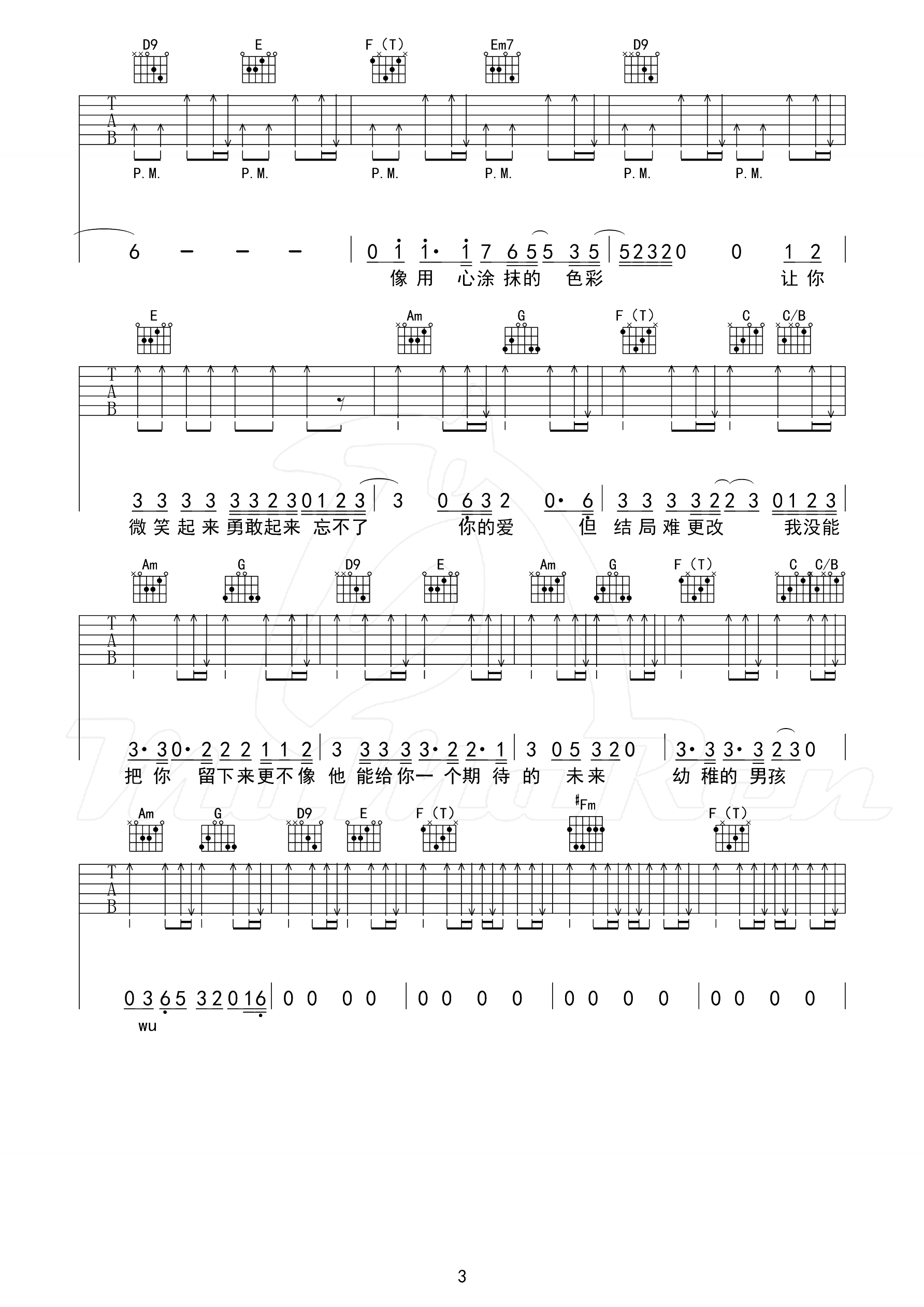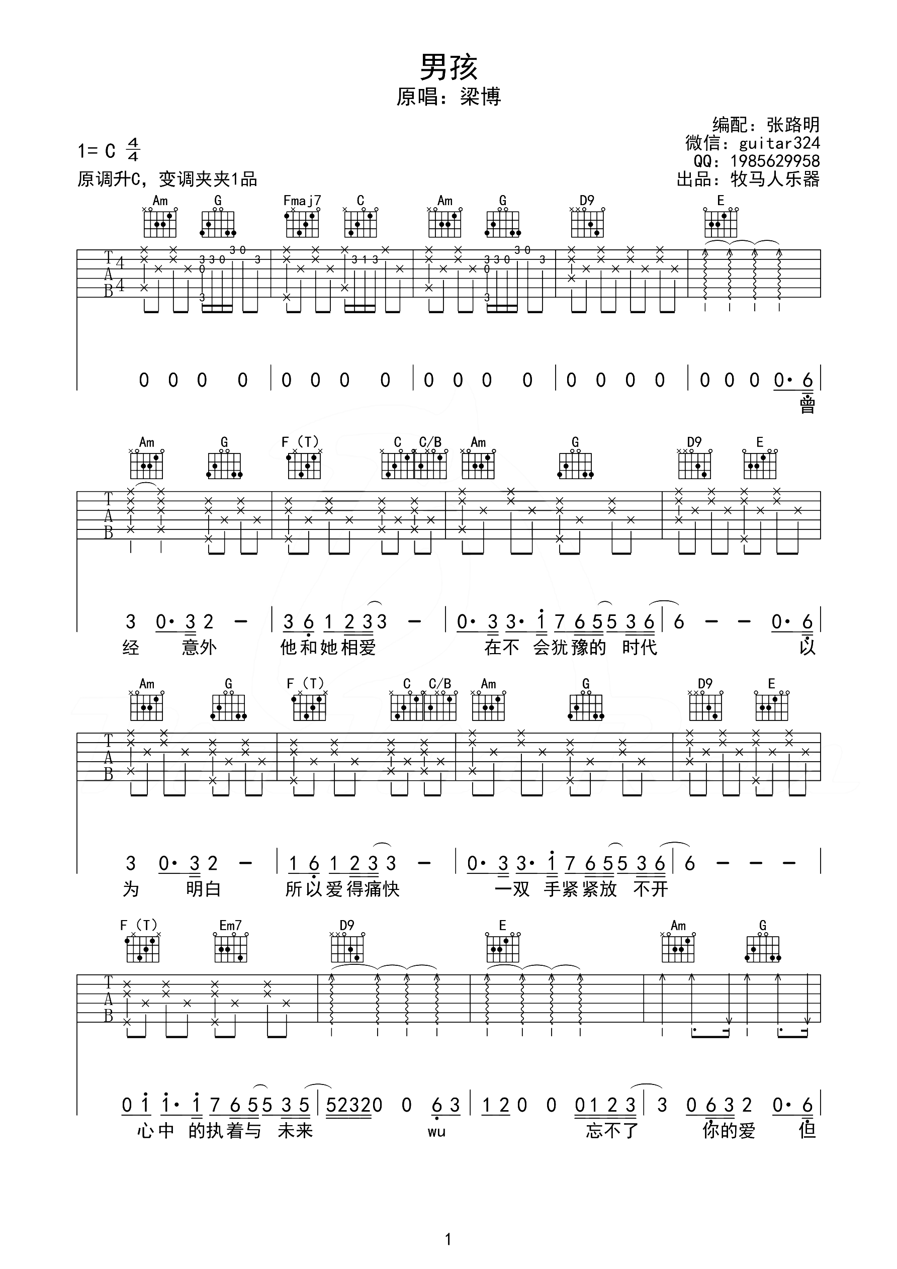 曲谱介绍: 男孩吉他谱,梁博创作并演唱的歌曲,用心的造词,动听的编曲,这首歌可谓是梁博非常诚意难得的好歌,”ai”为韵脚在这首歌反复出现,也体现除了他内心深处对音乐的热爱,以及对生活中大爱。 《男孩》吉他弹唱谱,选用C调指法,原调#C,变调夹夹1品弹唱原调,含完整前奏按原版编配,原版比例:90%,难度:3级。