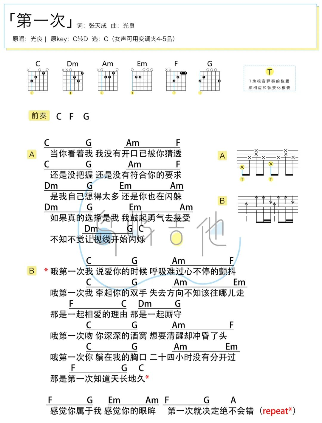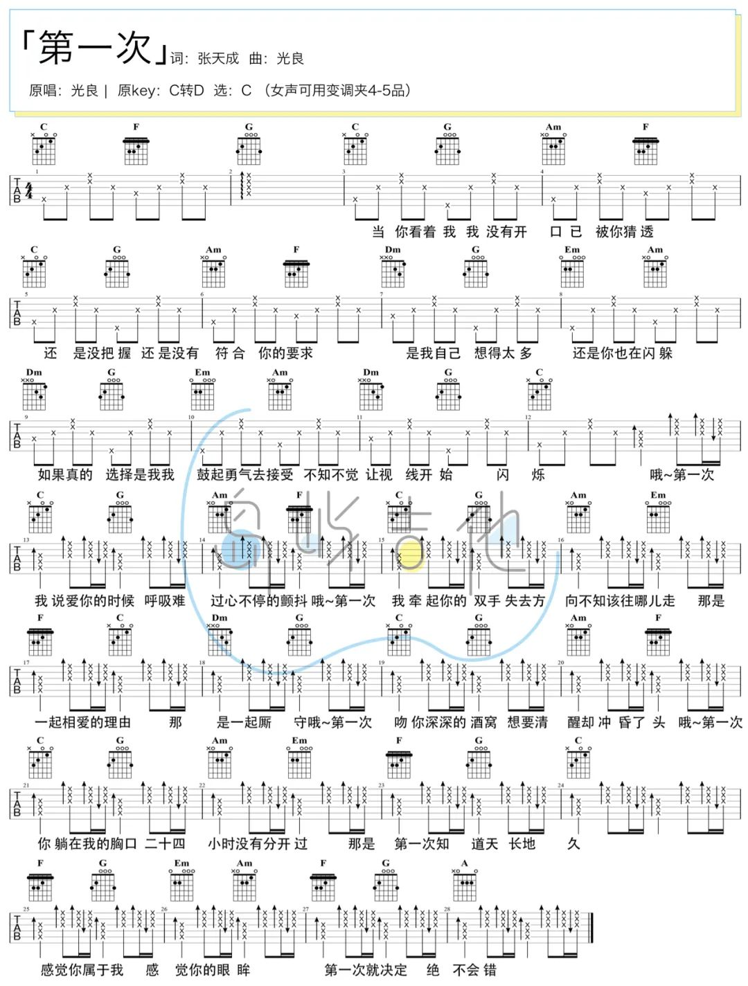 曲谱介绍: 光阴虽然飞逝,但我们依然记忆犹新在情窦初开的年纪,那些第一次的种种画面,永远无法忘却,这首歌让人回味到了也许是你人生中最特别的甜味时刻。 第一次吉他谱,岛屿吉他编配制谱,《第一次》吉他弹唱谱,共1张六线谱+1张和弦谱,选用C调指法,原调C转D,难度初级简单。光良就将一代人的青春唱成了惘然回忆。再听到时却依旧如一根温柔的刺,让你的心隐隐作痛。