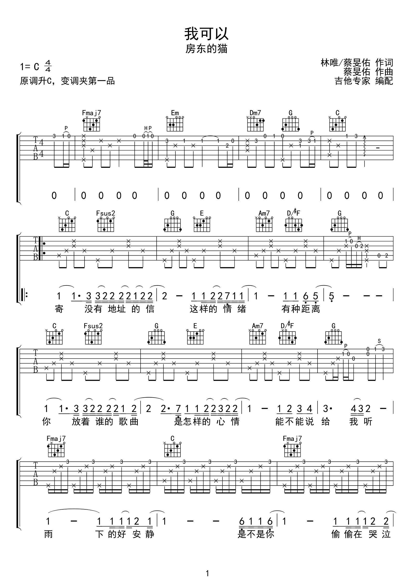 我可以吉他谱 - 房东的猫 - C调吉他弹唱谱