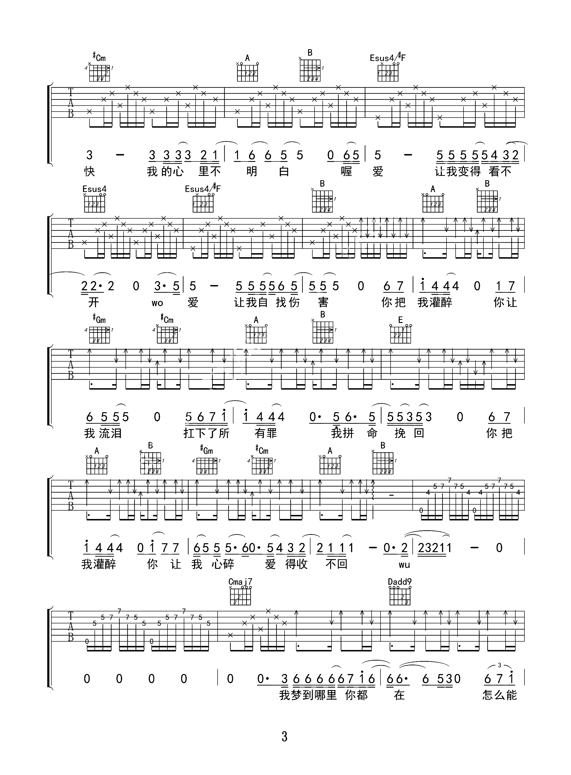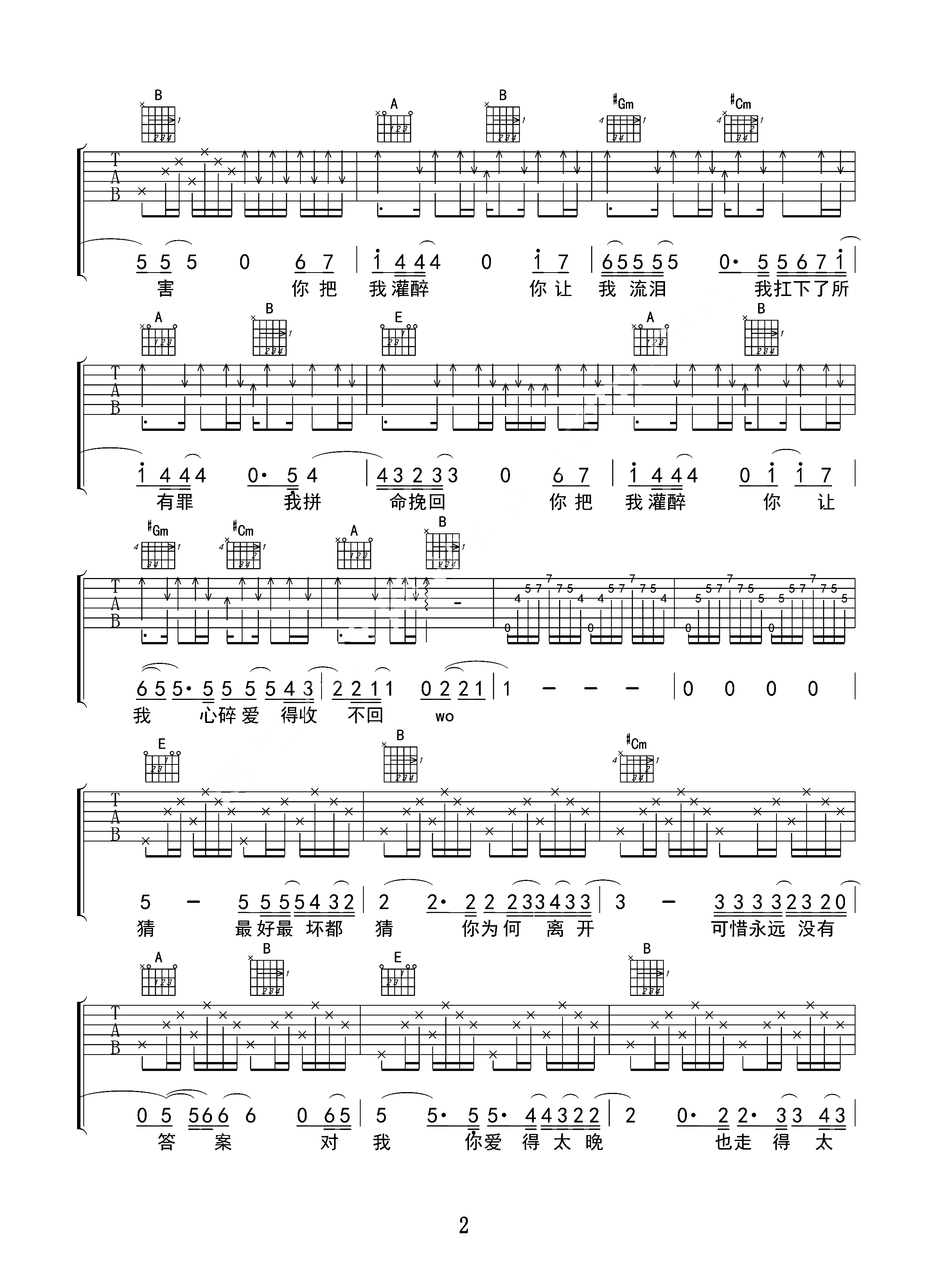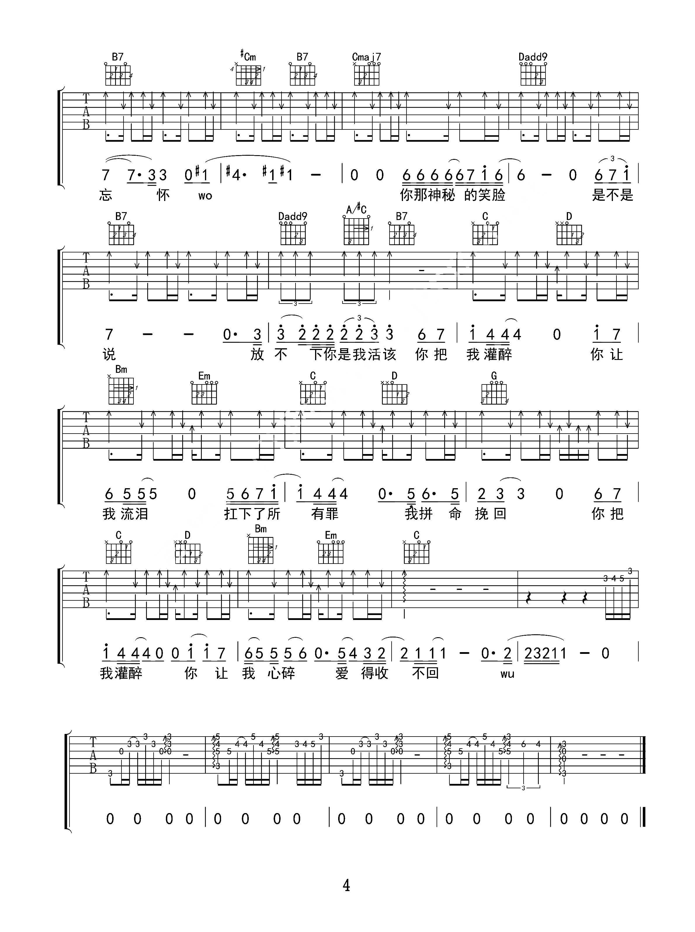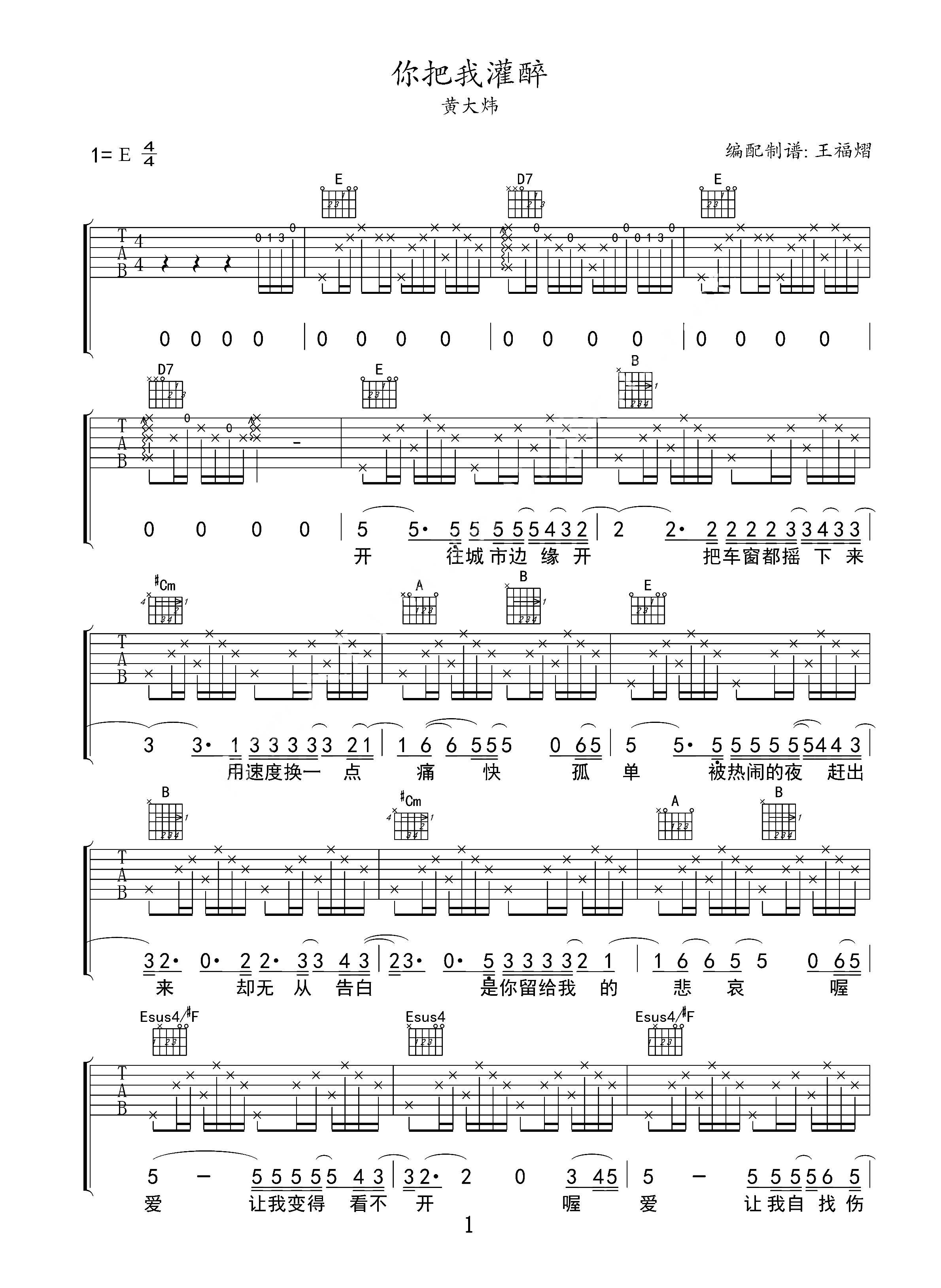 曲谱介绍: 你把我灌醉吉他谱,黄大炜原唱的伤感情歌,《你把我灌醉》吉他弹唱谱,选用E调指法,男生不用变调夹弹唱,共4张高清PNG图片谱,含完整前奏较接近原版,难度中级,有些横按新手需注意。