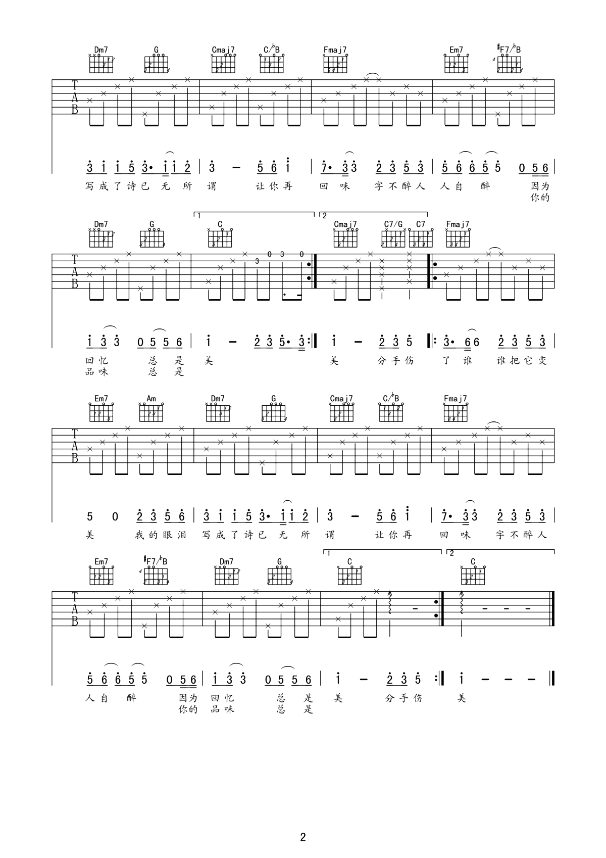 曲谱介绍: 眼泪成诗吉他谱,共2张高清PNG图片谱,选用C调指法,根据嗓音调整变调夹位置,含前奏按原版编配,弹唱难度初级较简单。