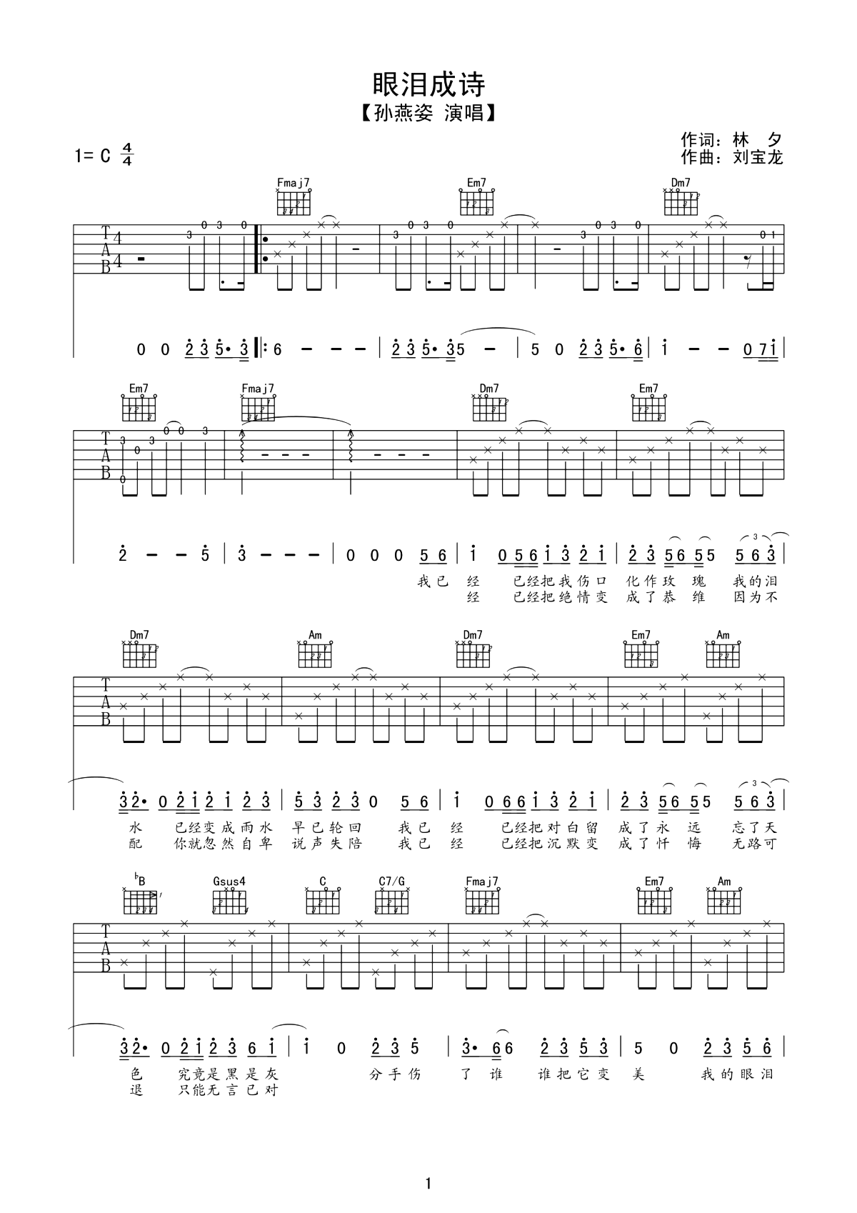 眼泪成诗吉他谱 - 孙燕姿 - C调吉他弹唱谱 - 原版