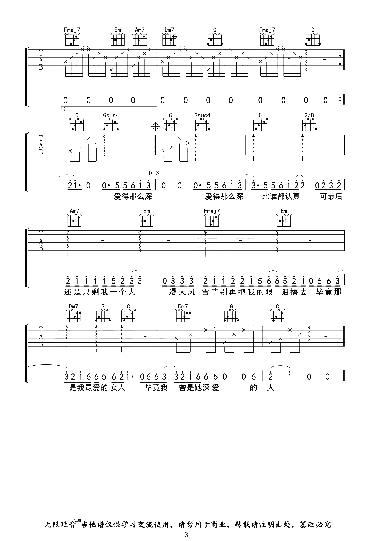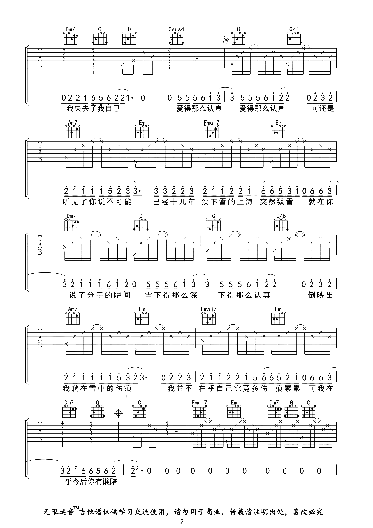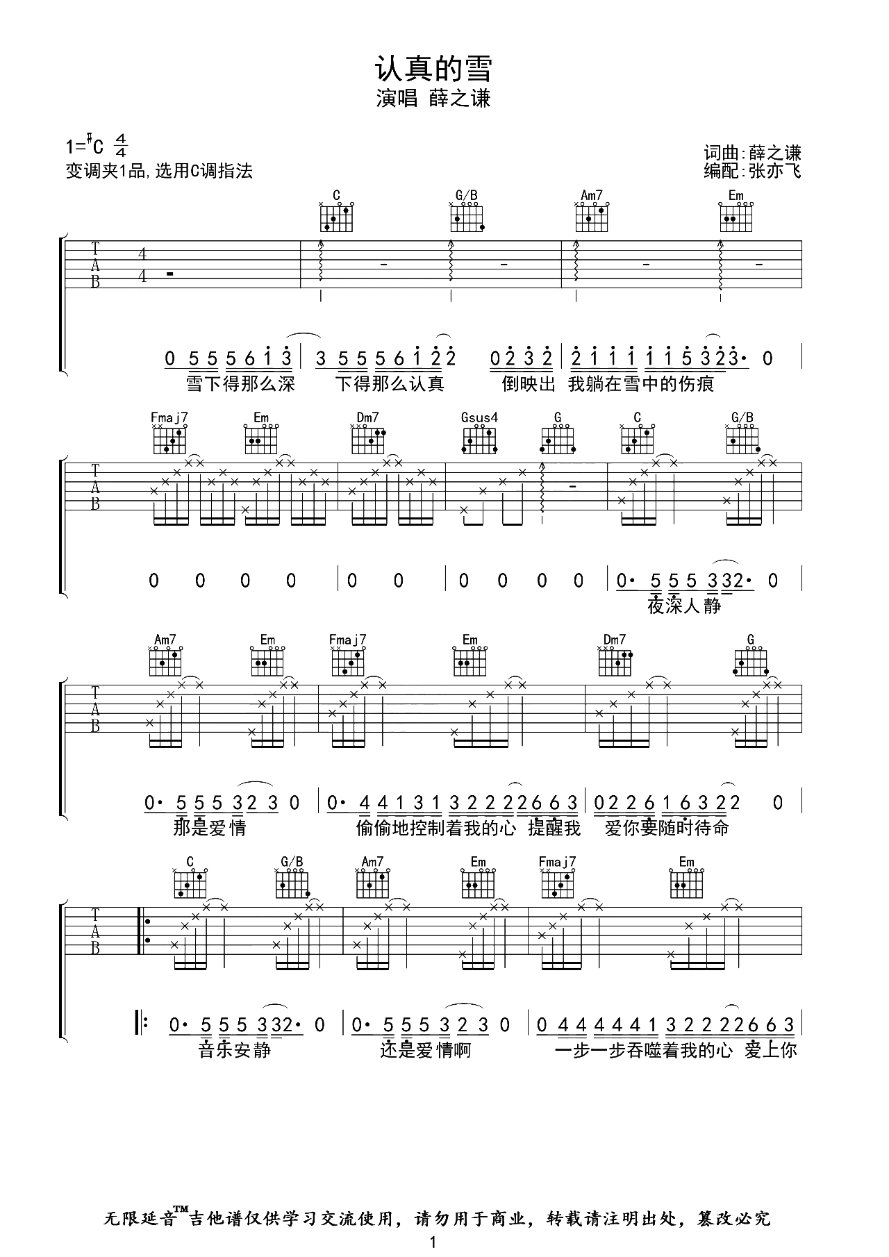 曲谱介绍: 认真的雪吉他谱,薛之谦演唱的经典伤感情歌,《认真的雪》吉他弹唱谱,选用C调,原调#C,变调夹夹1品弹唱原调,难度初级简单,按原版精细编配,节奏4/4拍,共有3张高清PNG六线谱图例。