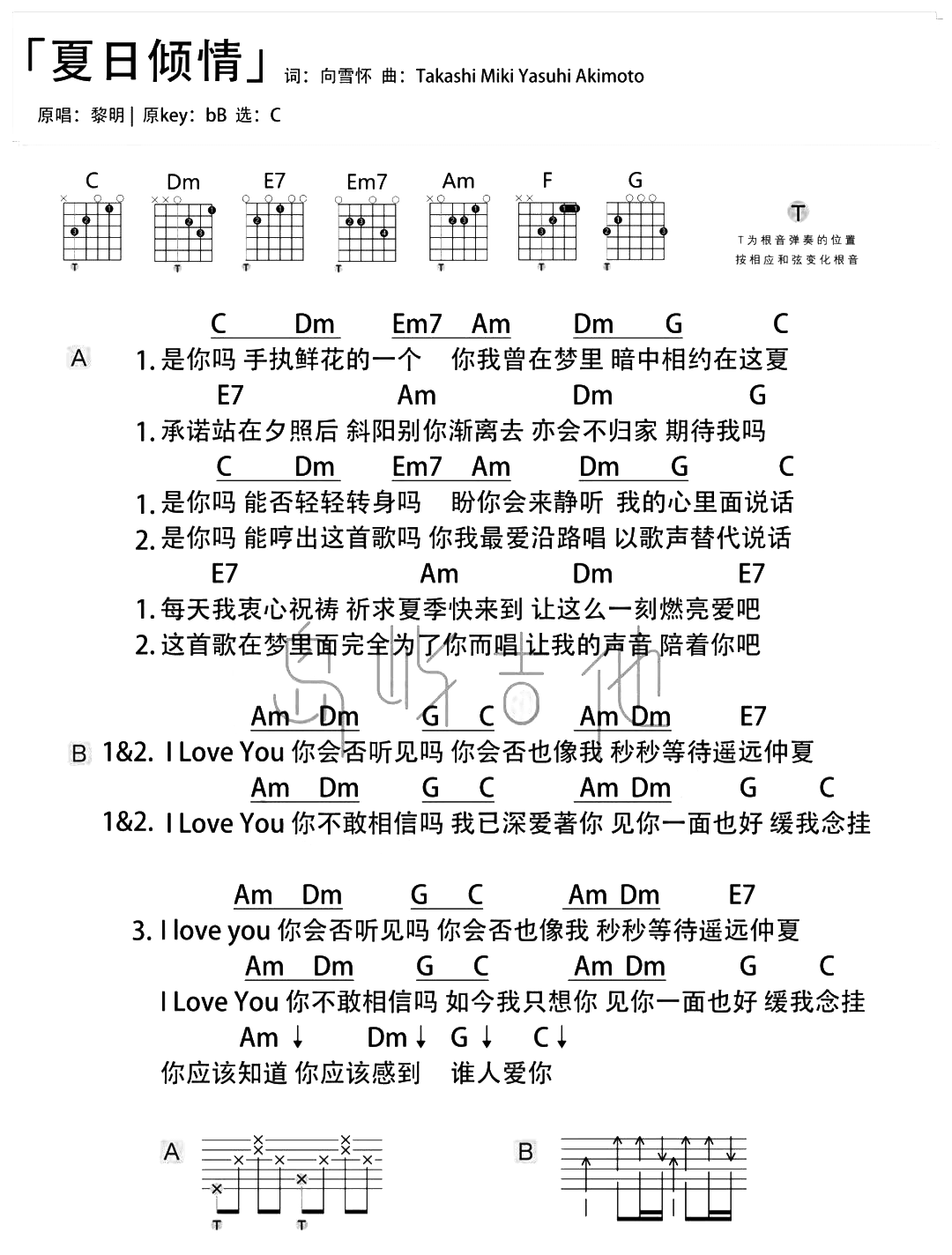 曲谱介绍: 卫兰翻唱黎明的《夏日倾情》,从女生角度出发,期待着在灿烂缤纷的夏季,男生的赴约。柔和轻盈,清新腼腆而真挚,犹如在耳边轻唱。 夏日倾情吉他谱,卫兰演唱,《夏日倾情》吉他弹唱谱,选用C调指法,原调bB,共1张六线谱+1张和弦谱,弹唱难度初级,比较适合新手练习。