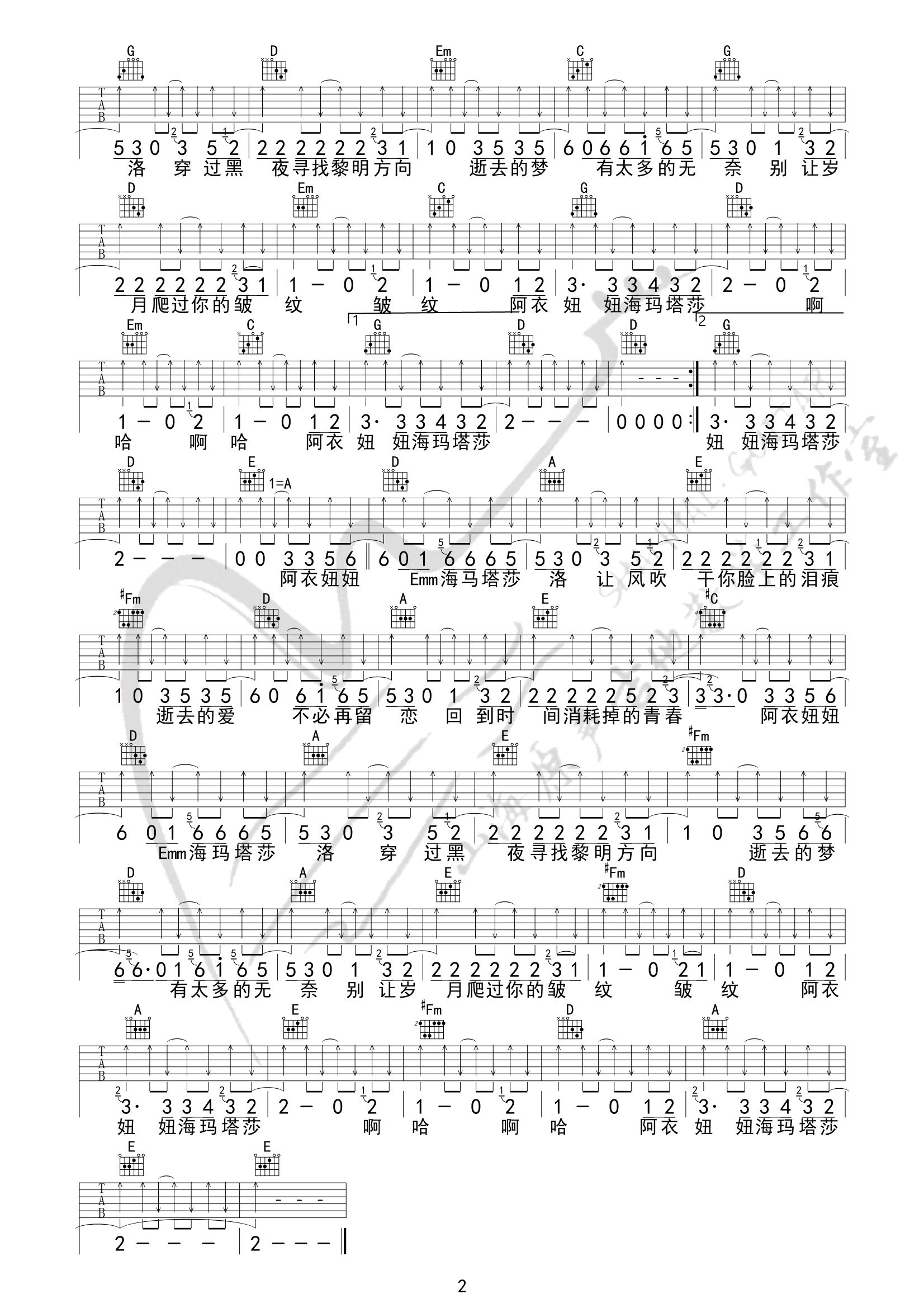 曲谱介绍: 阿吉太组合《阿依莫》,畅快渐进的曲风,总能拉动听众的情绪,久听之中发现了少数民族对女子心爱的那种热衷情绪,阿依莫在彝族的语言中是对姑娘的称呼,歌曲诠释着一个男子对心爱女子的表达,心爱的女子就像天上的闪亮星星一样,令男子无时无刻不在想念。 阿衣莫吉他谱,何奔洋制谱,选用G调指法,共2张高清图片谱例,原调G转A,弹唱可不用变调夹,难度初级较简单。