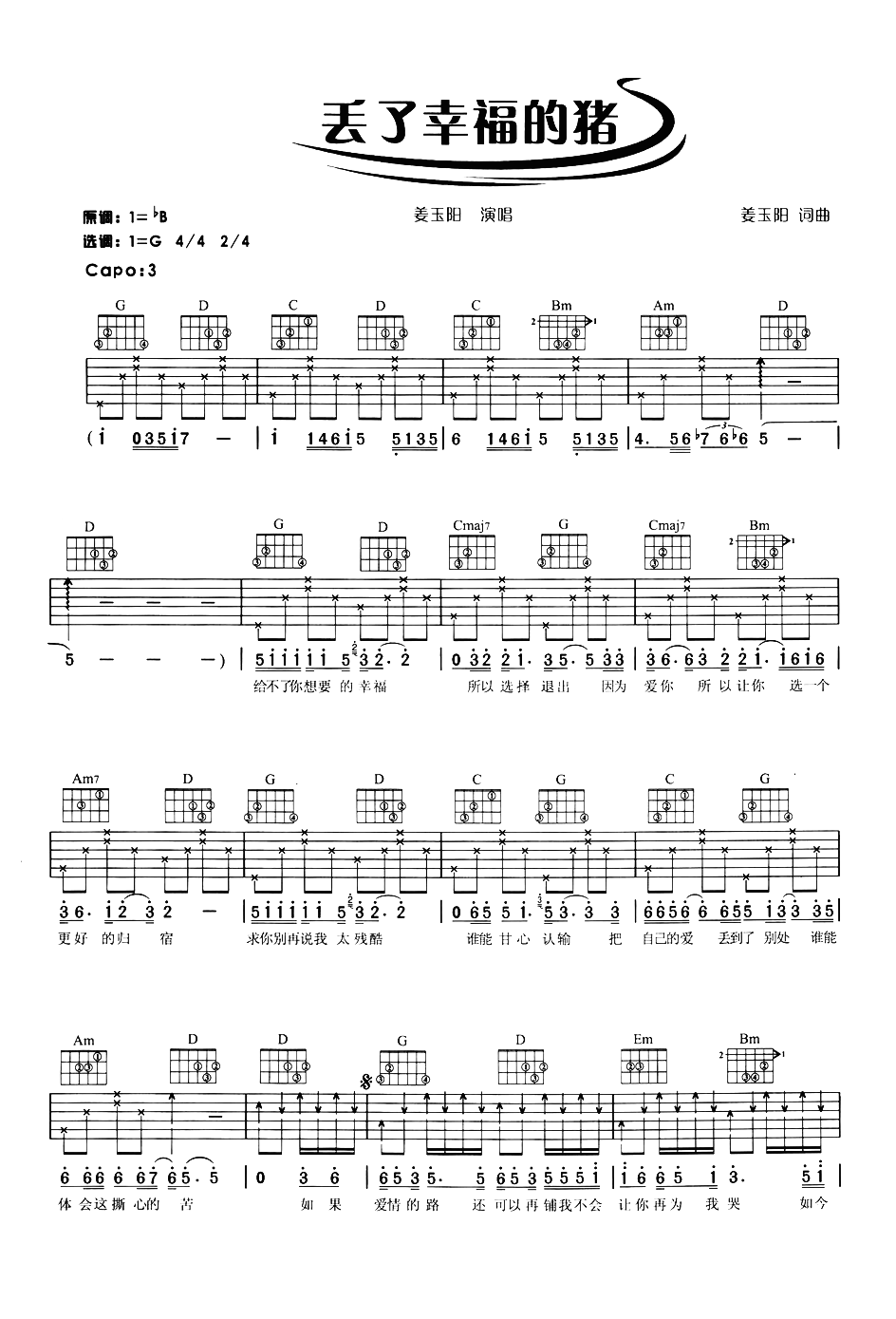 丢了幸福的猪吉他谱 - 姜玉阳 - G调吉他弹唱谱