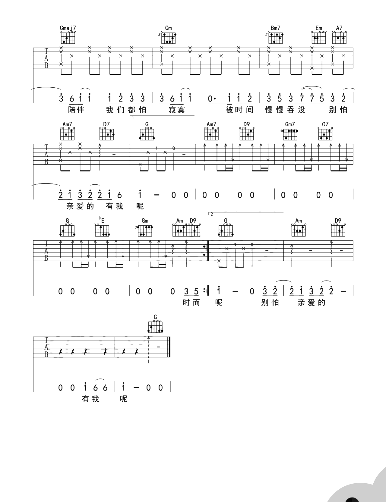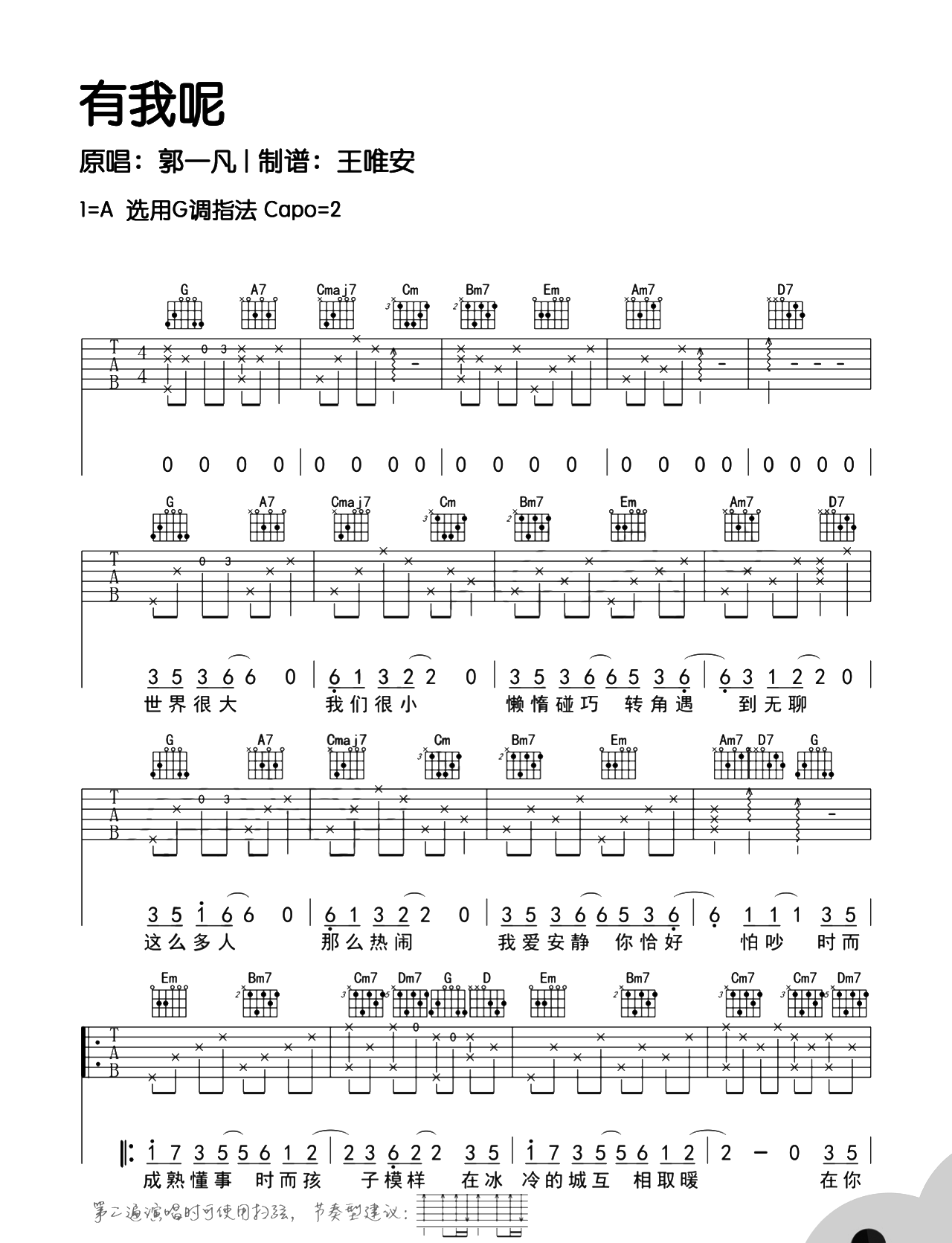 曲谱介绍: 郁一凡《有我呢》吉他谱,共3张高清PNG图片谱,选用G调指法,原调A调,CAPO夹2品弹唱原调,让我们一起来弹唱这首温馨动情的歌曲吧。