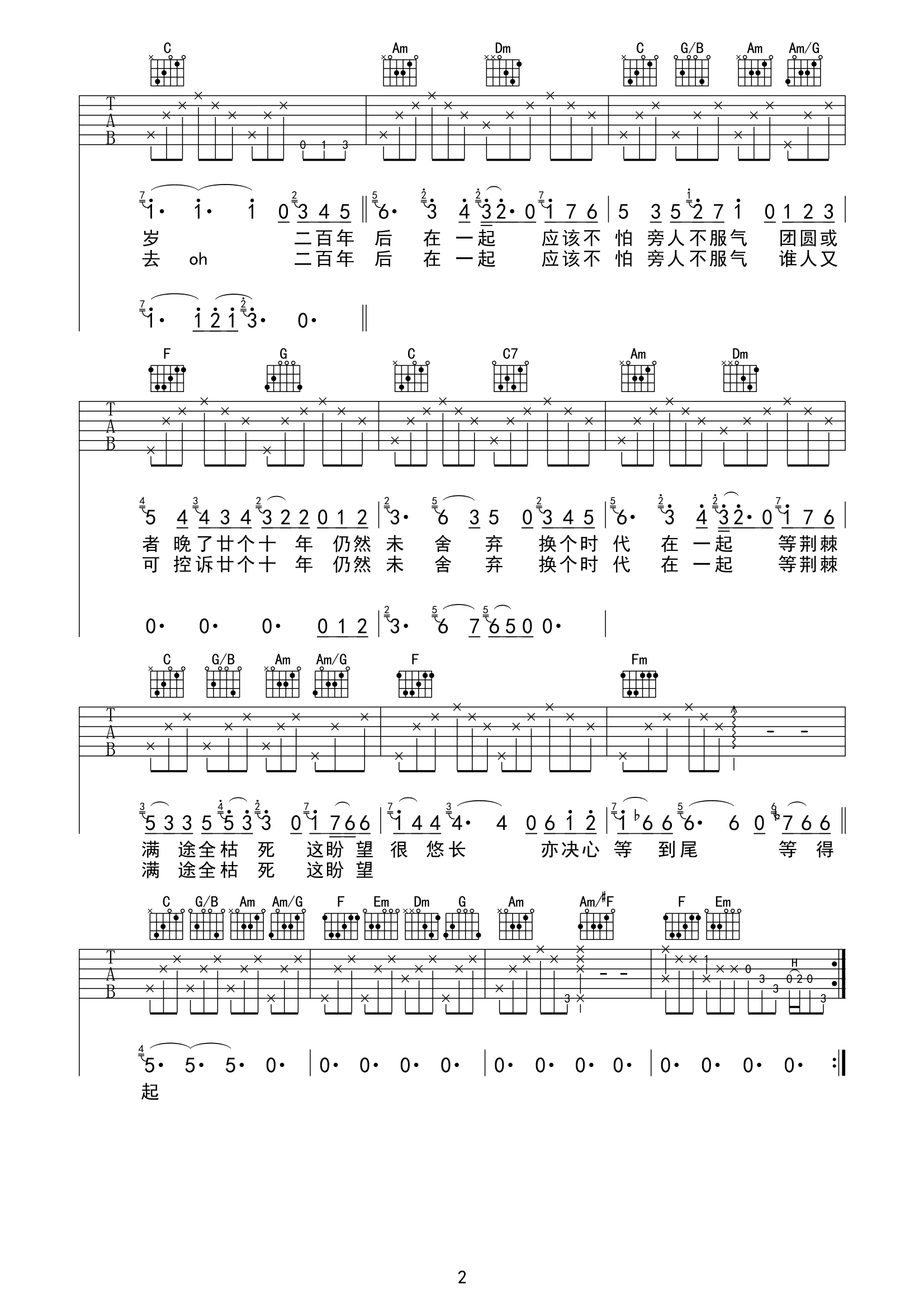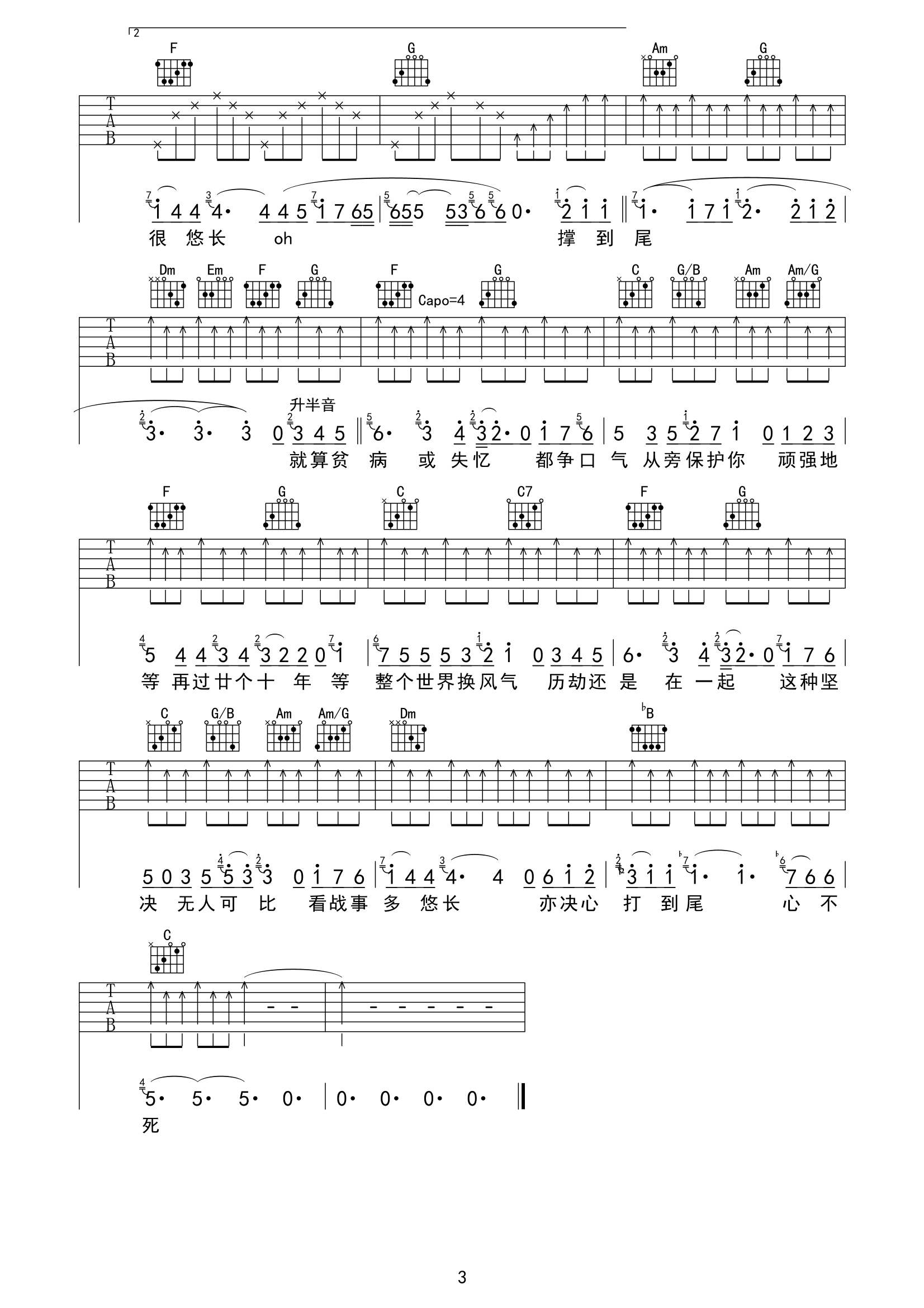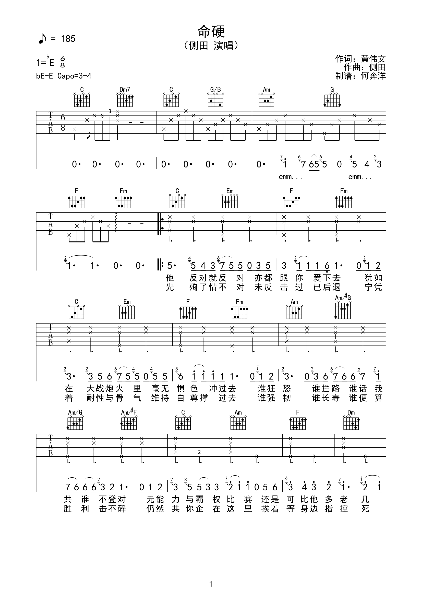 曲谱介绍: 《命硬》由黄伟文作词,侧田作曲并演唱的代表歌曲,艰难的爱情总在寻找着自己的出路,而侧田用自己歇斯底里的演唱方式,延续了这份爱情,也许“命硬”就是表达着那份爱情的坚固及旺盛的生命力。 侧田《命硬》吉他谱,共3张高清图片谱,选用bE调编配,CAPO推荐3-4品,本谱含前奏,较接近原版,弹唱难度1/5。