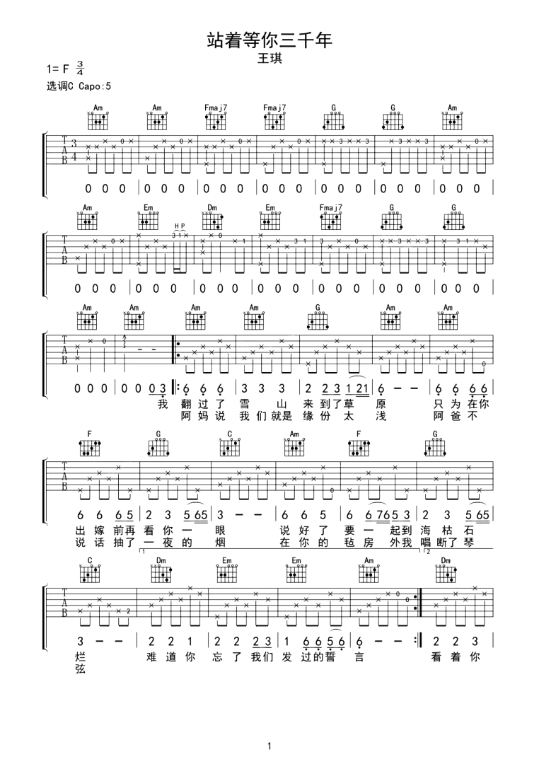 曲谱介绍: 站在等你三千年吉他谱,王琪演唱,以草原情事为背景的歌曲,极强的带入感深刻且直入人心,千古绝唱般的凄凉、悲壮的演唱嗓音,声声催人泪下,有些感情一等就是一辈子,而这三千年也许是多少个“来世”。 《站着等你三千年》吉他弹唱谱,选用C调指法,原调F调,CAPO建议夹5品弹回原调,共两张高清PNG图片谱,按原版编配,含完整前奏。