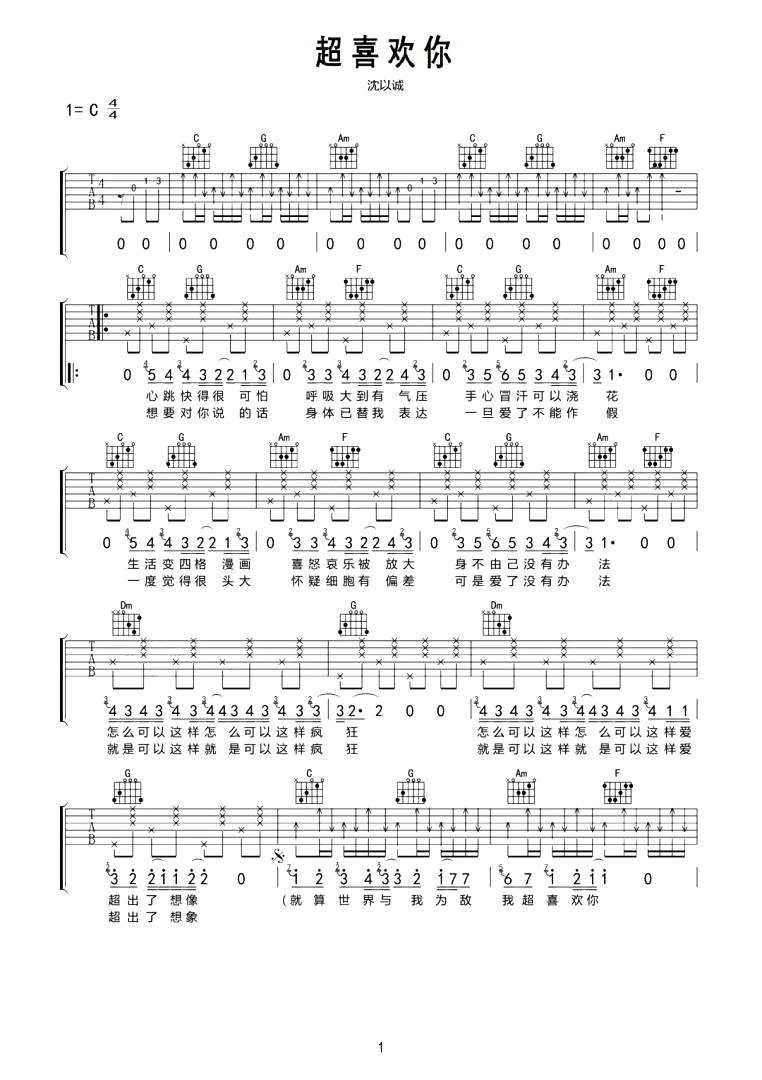 超喜欢你吉他谱 - 沈以诚 - C调吉他弹唱谱