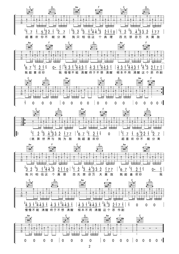 曲谱介绍: 沈以诚《超喜欢你》吉他谱,共两张高清图片谱例,选用C调指法,按原版编配,弹唱难度适中,需要把握好扫弦节奏层次感,根据嗓音调整去调整CAPO位置。