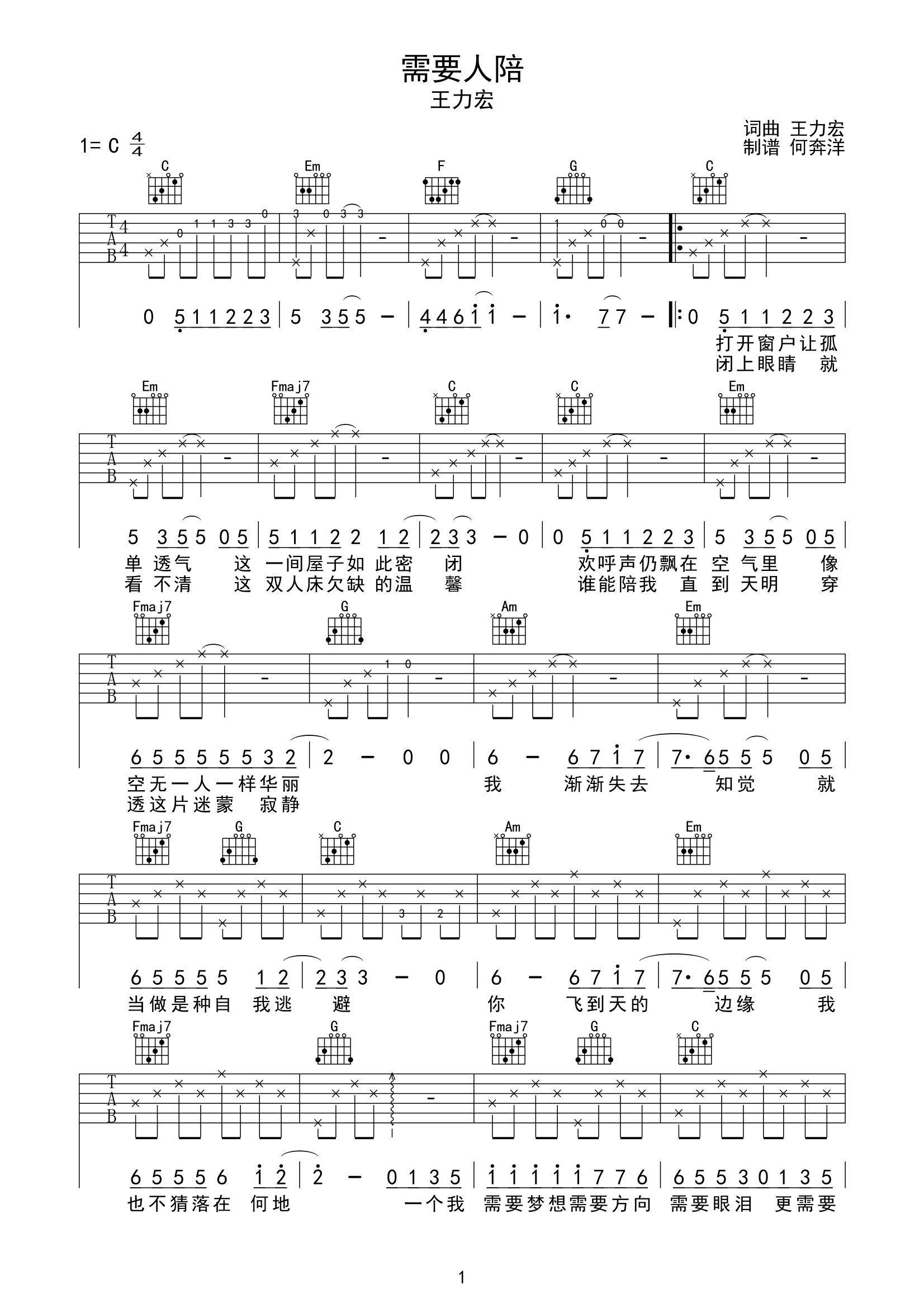 需要人陪吉他谱 - 王力宏 - C调吉他弹唱谱 - 原版