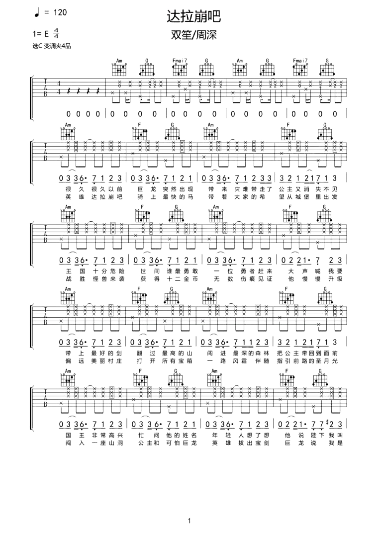 曲谱介绍: 《达拉崩吧》原本是一首二次元的歌曲,周深的创意唱功几乎把这首神曲点燃了全场。一连串串又长又怪的词句和跳跃的音符不断重复,魔性得让人叹为观止,全曲听下来可以完全一气呵成到结束,十分的洗脑。 周深/双笙《达拉崩吧》吉他谱,共4张高清六线谱图例,选用C调指法,CAPO夹4品弹唱原调E调,本谱完整,主要以拍弦+延音的右手节奏型弹唱,速度控制在120拍每分钟即可。