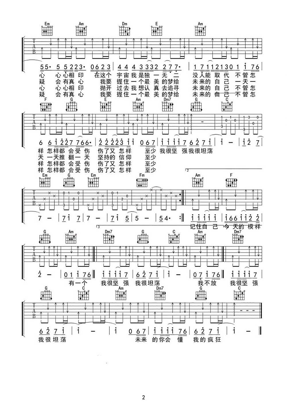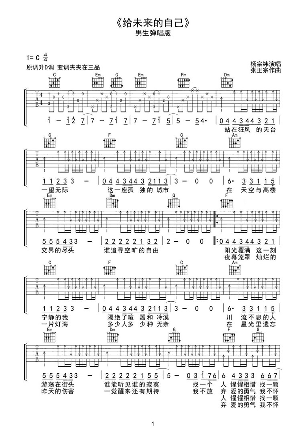 曲谱介绍: 给未来的自己吉他谱,杨宗纬演唱。 《给未来的自己》吉他弹唱谱,根据男生版编配,选用C调指法,原调#D,CAPO建议夹3品弹回原调,共2张PNG图片谱例,难度2/5。