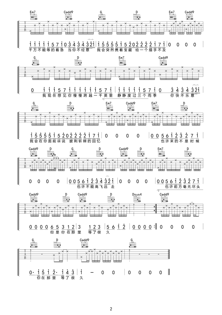 曲谱介绍: 《寻宝》是由沈以诚作词作曲并演唱的歌曲,摸爬滚打都是为了成全自己内心的心底梦想,而”寻宝”是指寻找自己最想得到的东西,让闭上眼睛到心流时刻去想想,或许我们已经发现了属于自己的心底宝藏。 沈以诚《寻宝》吉他谱,共2张高清纯净版图片谱,选用G调指法,CAPO夹4品弹回原调B掉,含完整前奏,全谱按原版编配,难度初级简单。