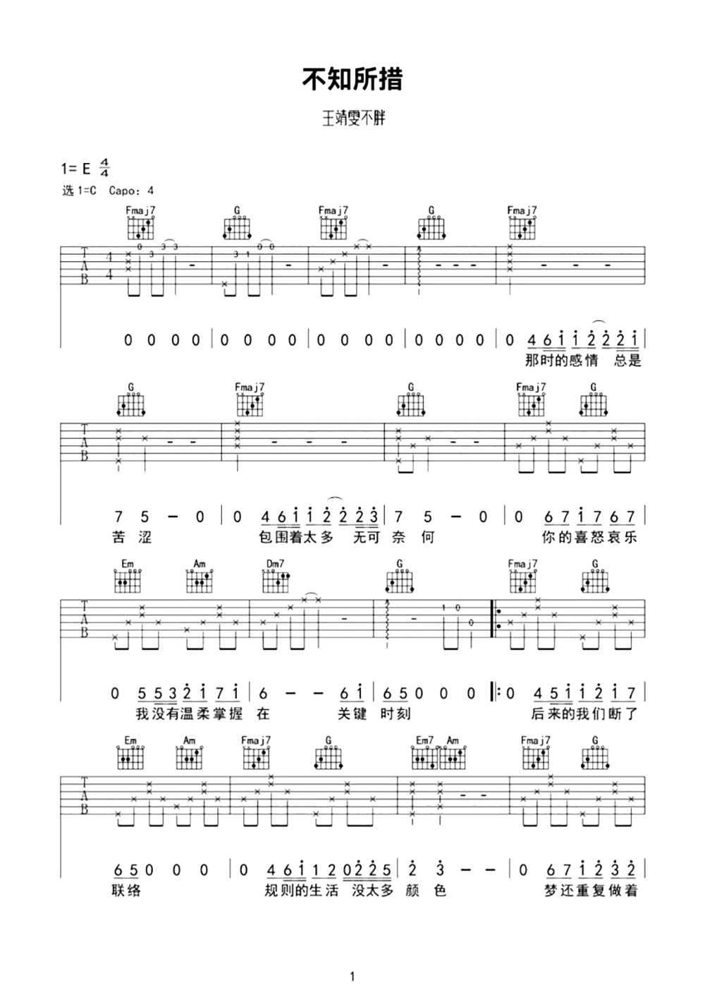 曲谱介绍: 王靖雯《不知所措》,不是所有浪漫的爱情越是会被折磨,灿烂的烟火也终将会熄灭坠落,歌曲用伤感的方式诠释着,面对无法回头的感情,不知所措的那种低落情绪,总让我们在歌中找到共鸣的痕迹。 王靖雯《不知所措》吉他谱,高清纯净版,选用C调指法,原调E调,CAPO夹4品,本谱为简单原版,含前奏,还原度:75%,难度2/5。