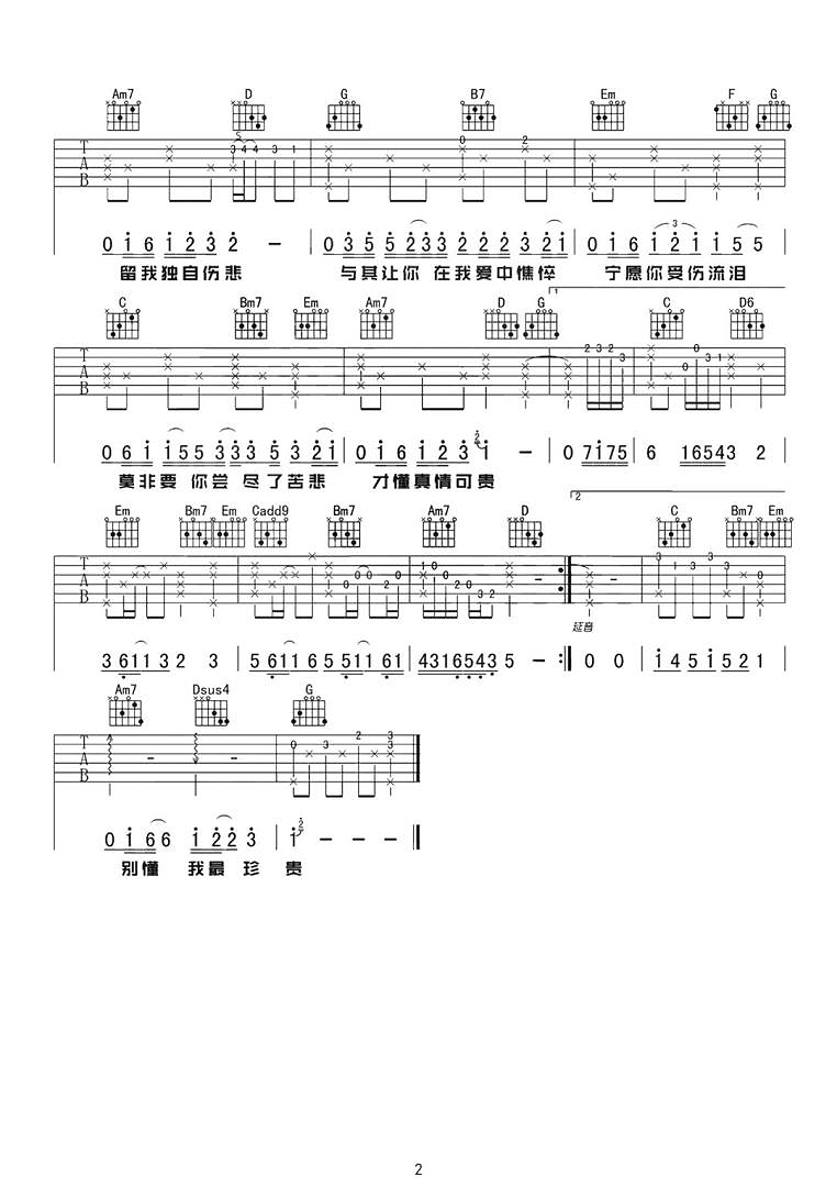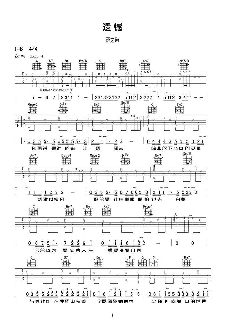 曲谱介绍: 遗憾吉他谱,是薛之谦在综艺节目《蒙面唱将猜猜猜》中翻唱的歌曲,舒缓感伤的旋律,再配合上厚重而质感的嗓音,把我们瞬间带入到了属于男人“遗憾”的情感世界,但其实爱情的离别选择,是为了让你飞向更好的世界。 《遗憾》吉他弹唱谱,共2张高清吉他六线谱例,选用G调指法,原调B调,CAPO夹4品弹回原调,本谱细节全部精编处理,变化较多,但实际上注意多熟悉就好,弹唱难度:3/5。