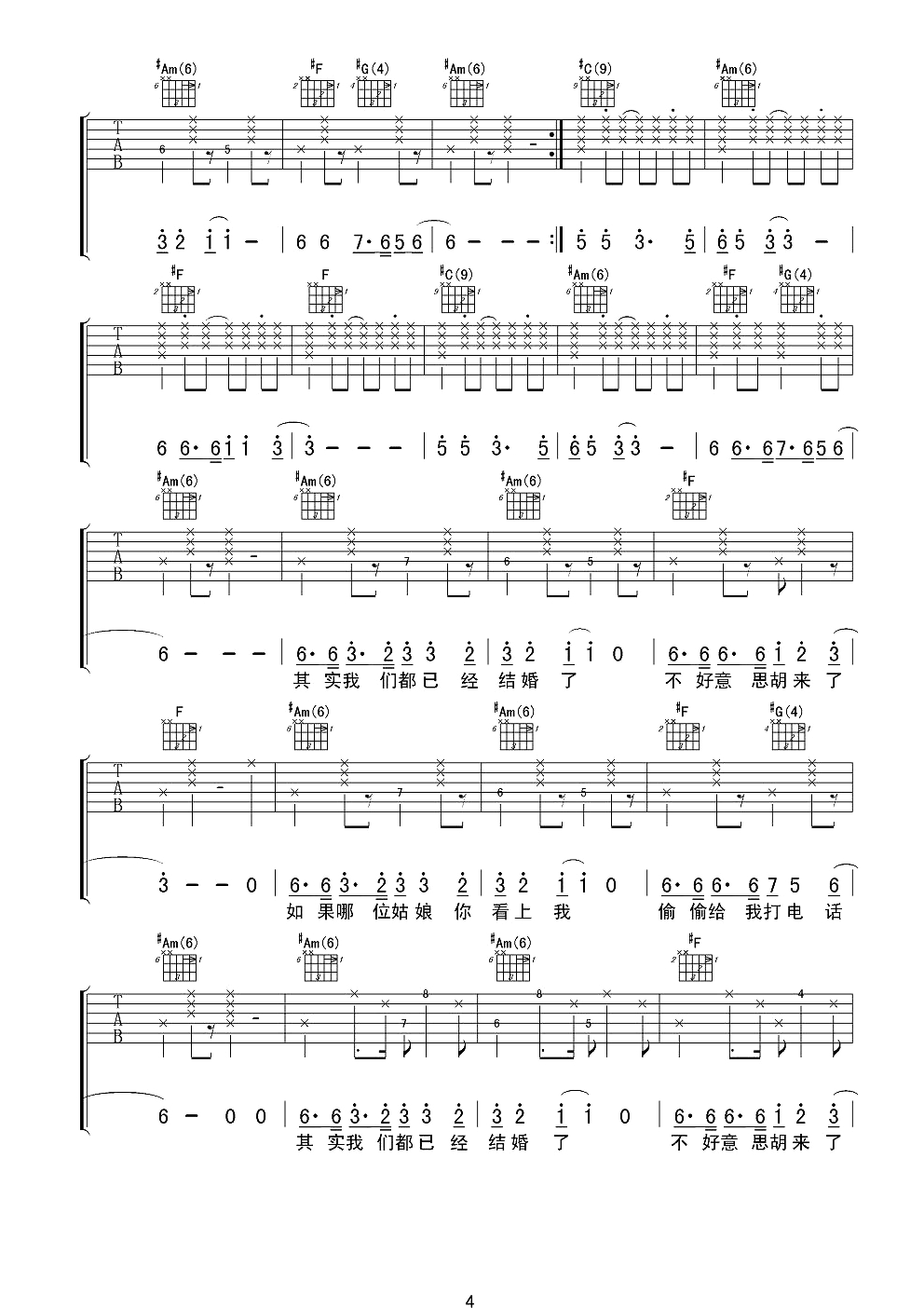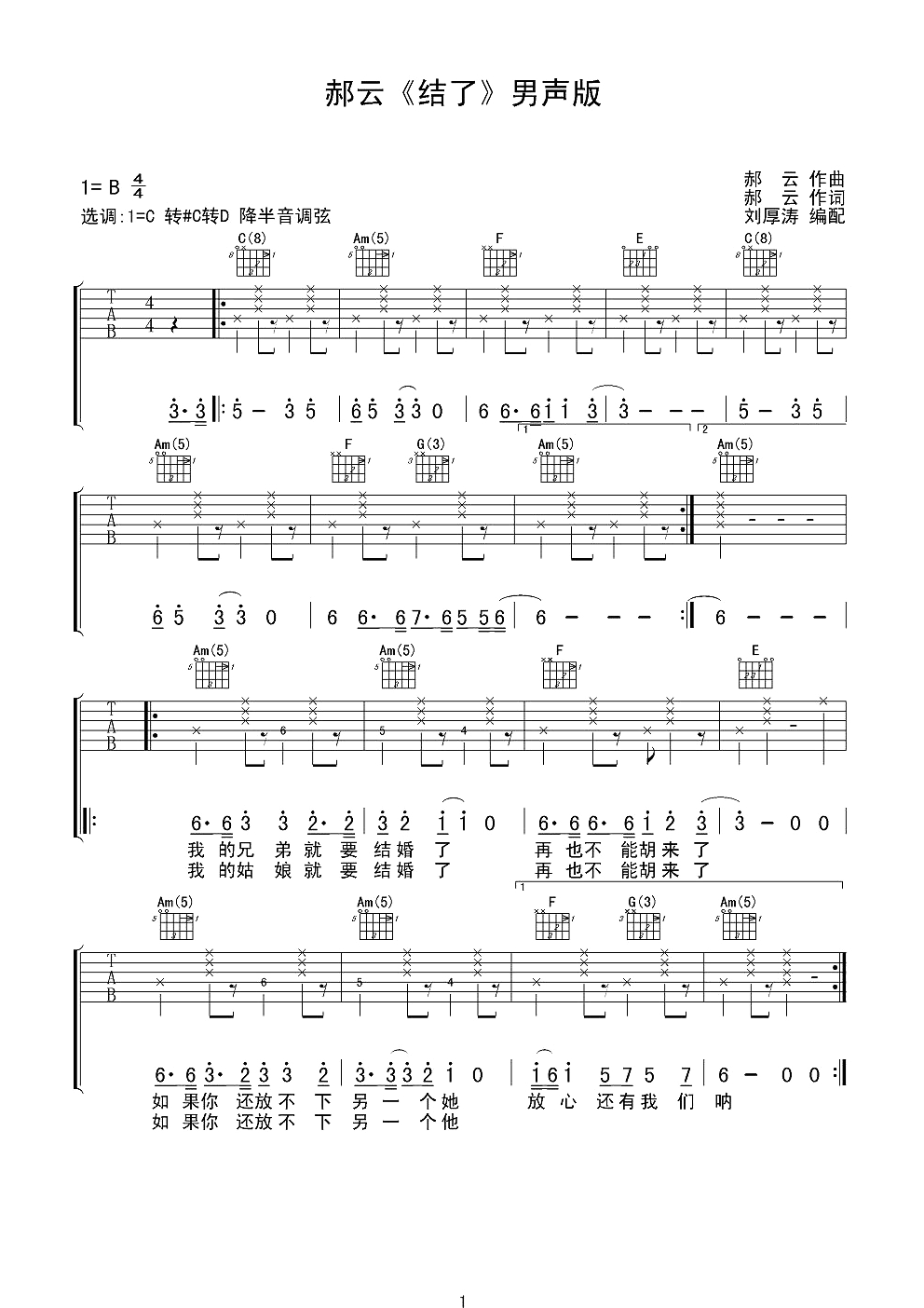 曲谱介绍: 满带喜感的“喜庆民谣”《结了》,趣味中不乏耐听,郎朗上口的歌词,配合幽默风趣的演唱形式,绝对是损友对哥们“脱单”的衷心祝福,歌曲中透露出的号码“13910733521”,更是让人对这独特的创意叹为观止。 郝云《结了》吉他谱,刘厚涛制谱,选用C转#C转D调指法,原调B调,弹唱原调需要降半音调弦,本谱超原版编配,共有6张高清PNG纯净图片谱,难度适中,本曲较长变化较多,弹唱需要注意细节。