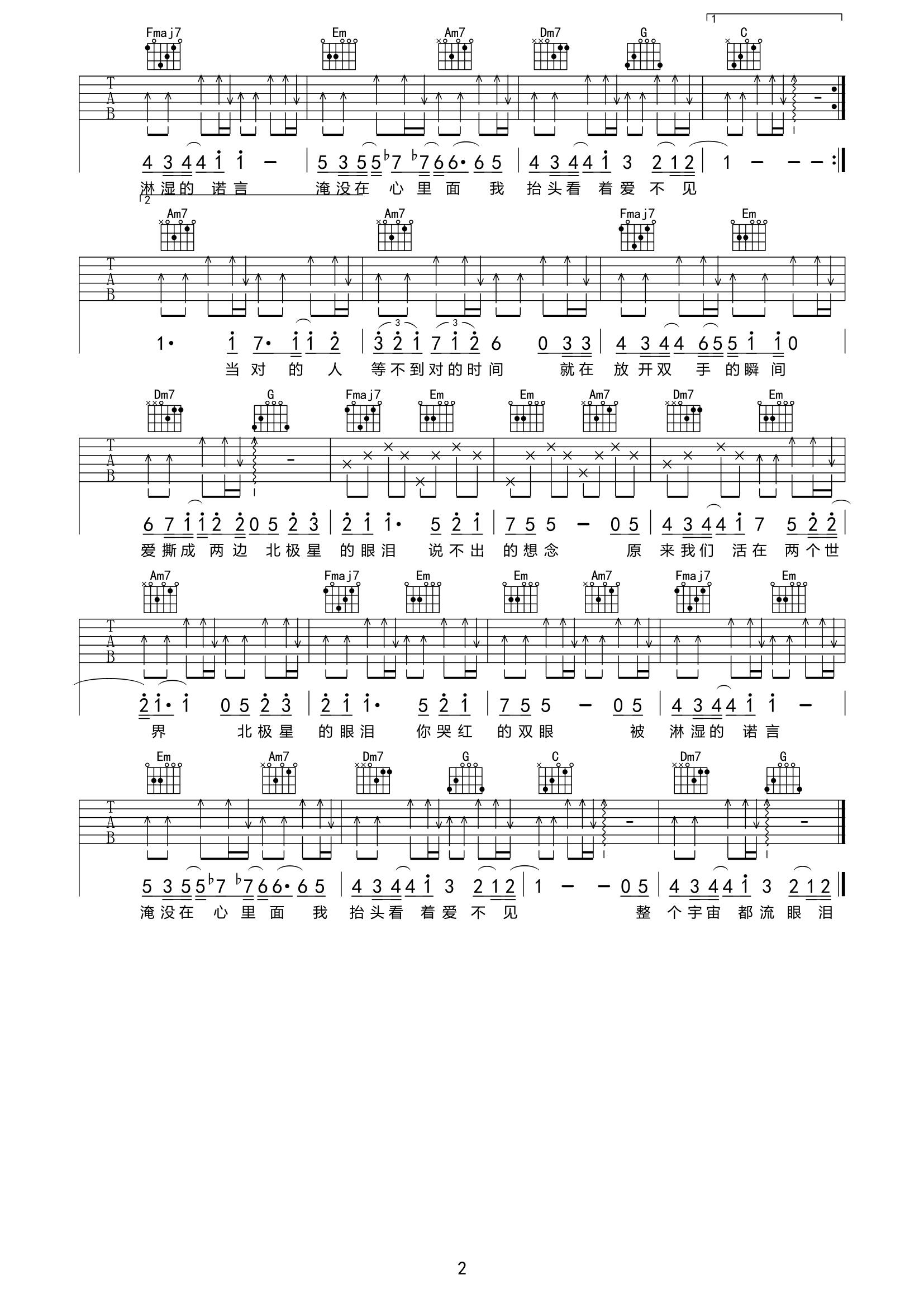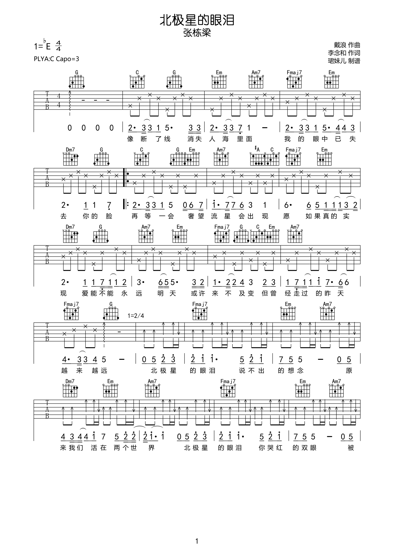 曲谱介绍: 张栋梁《北极星的眼泪》,是台湾经典偶像剧《微笑pasta》的主题曲,旋律舒缓略带悲伤感,层次感起伏,情绪拉到最高点仿佛看到了“北极星的眼泪”,歌曲在剧中的背景讲述了一段成长与追求的故事,现在听到还是满满的回忆与不舍。 北极星的眼泪吉他谱,由珺妹儿制谱分享,《北极星的眼泪》吉他弹唱谱,选用C调,原调bE,CAPO夹3品弹唱原调,版本难度较简单,共2张高清PNG图片谱。