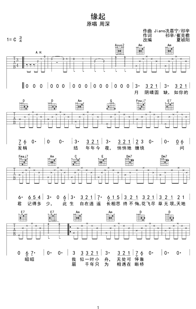 缘起吉他谱 - C调吉他弹唱谱 - 原版