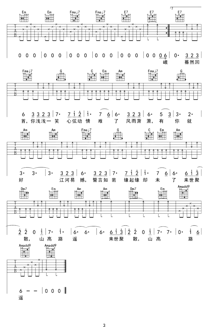 曲谱介绍: 缘起吉他谱,周深演唱动画电影《白蛇:缘起》的主题曲,一词一句尽诉相思之情,悲欢聚散终有时,爱情中总会出现这样的剧情。 《缘起》弹唱六线谱,选用C调指法,可根据音域条件调整CAPO位置,共3张高清图片谱,本谱按原版编配,弹唱难度较简单。