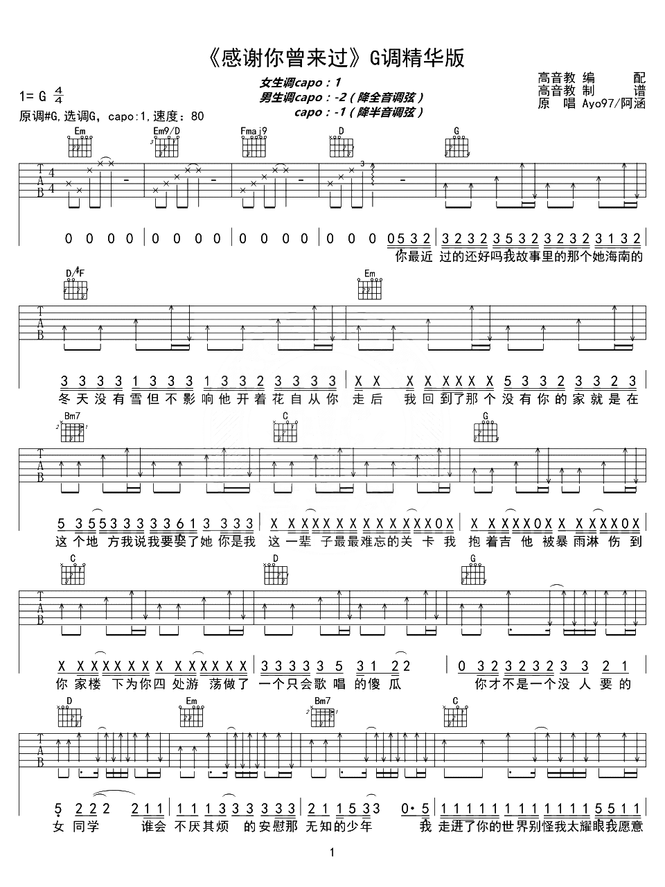 感谢你曾经来过吉他谱 - 阿涵/AYO97 - G调吉他弹唱谱 - 原版
