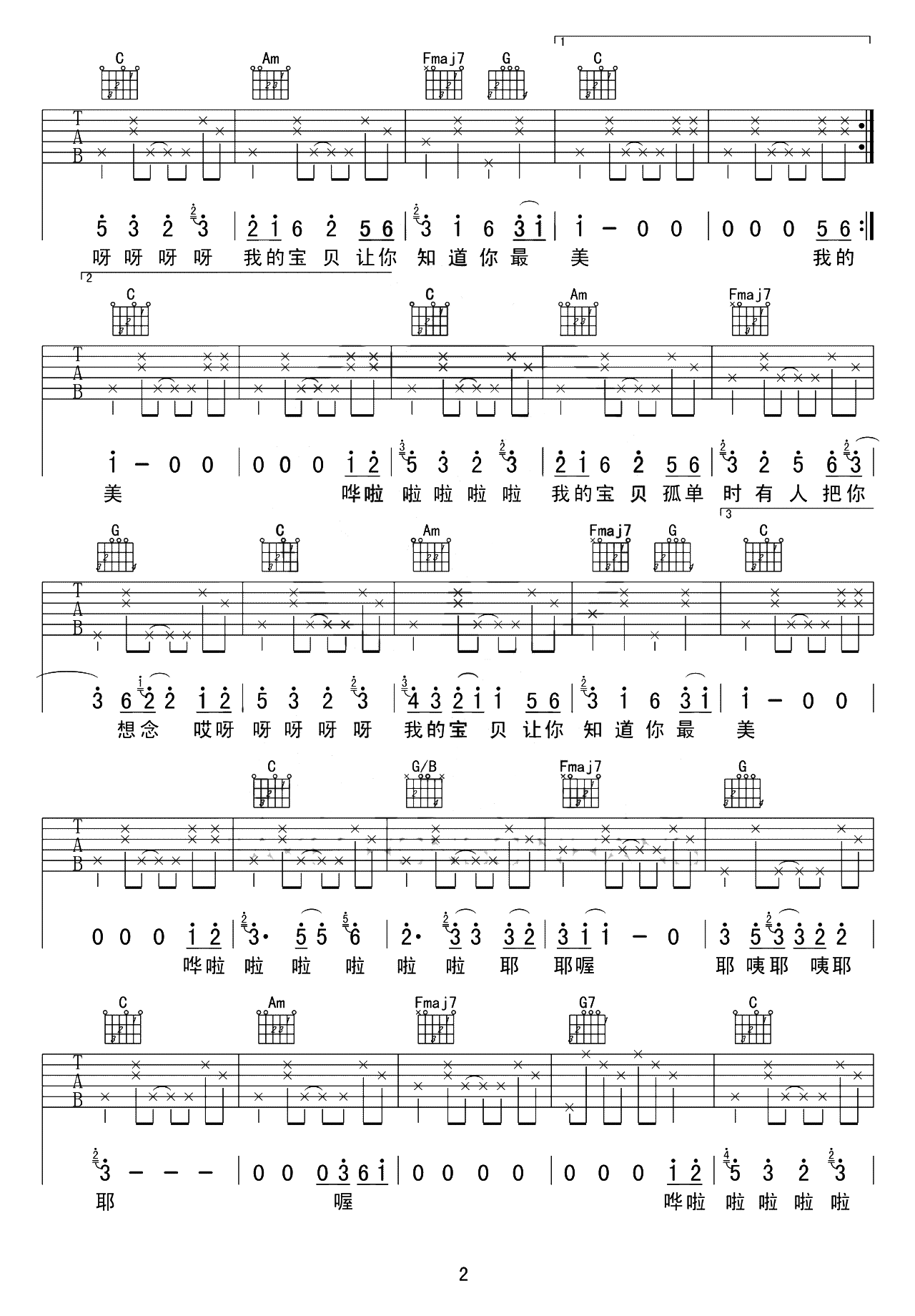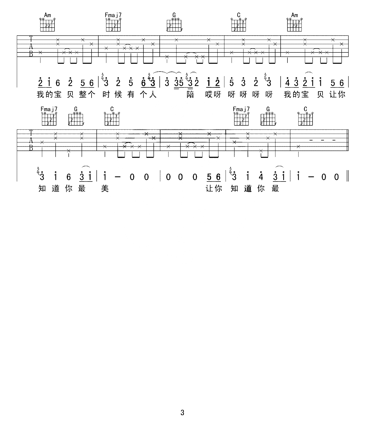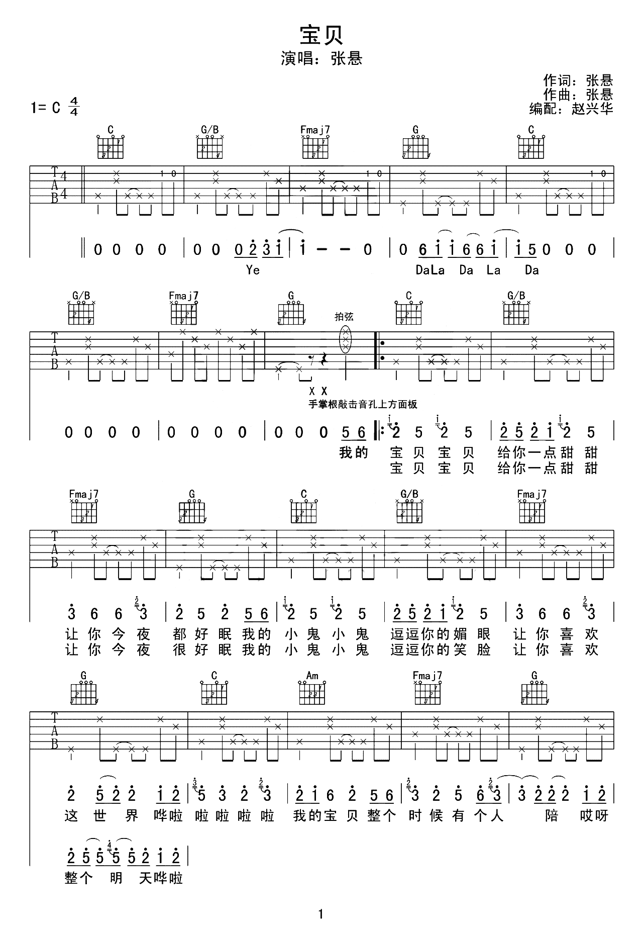 曲谱介绍: 张悬《宝贝》,清新的超甜歌曲,简单中透出了浪漫的气息,无比的诠释着热恋中恋人们的场景,宠爱人一身,就在于每天从早到夜的心有“宝贝”。 宝贝吉他谱,由赵兴华老师编配制谱,选用C调指法,可根据演唱音调调整CAPO位置,本版按原版编配,弹唱难度2/5,共3张高清PNG六线谱图例。