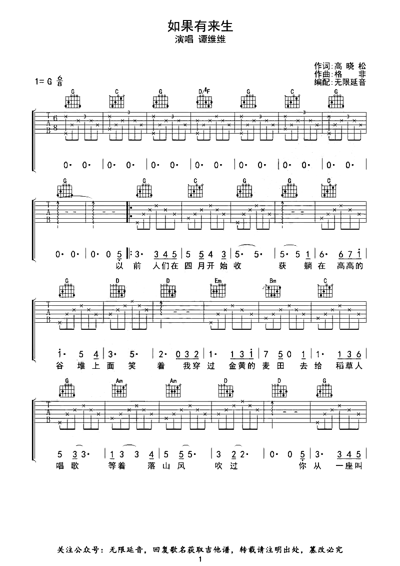 曲谱介绍: 如果有来生吉他谱,谭维维演唱的歌曲,谭维维轻柔的咬字如同在耳边喃喃细语,层层递进的节奏,让人感受到了回味无穷的画面,无限的憧憬是一种新生淡然的升华,“如果有来生”是一种对爱向往的纯粹表达。 《如果有来生》吉他弹唱谱,超原版编配,选用G调指法,标准调音可不用变调夹,节奏6/8拍,包含完整前奏,随谱附弹唱示范音频,难度2/5。