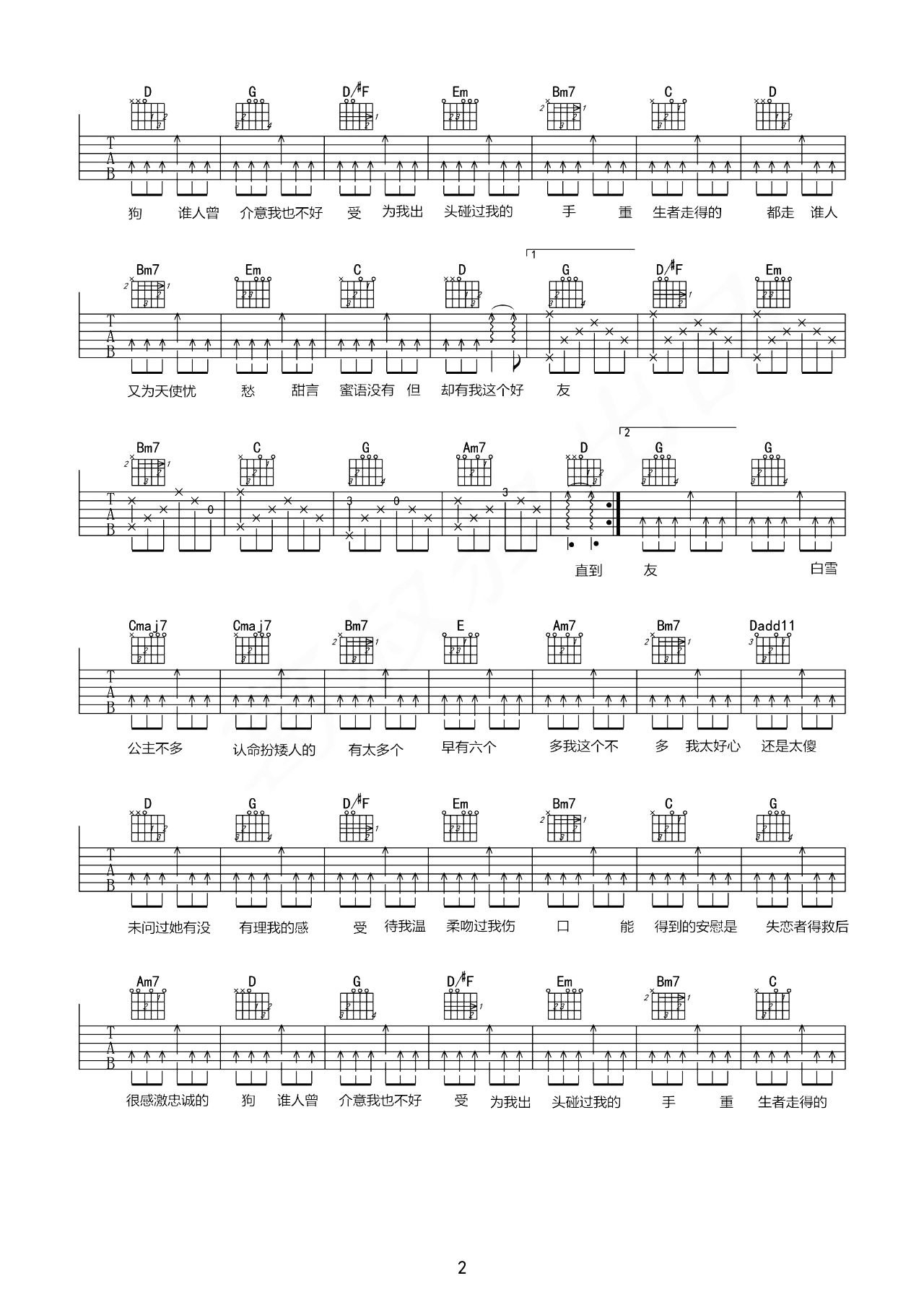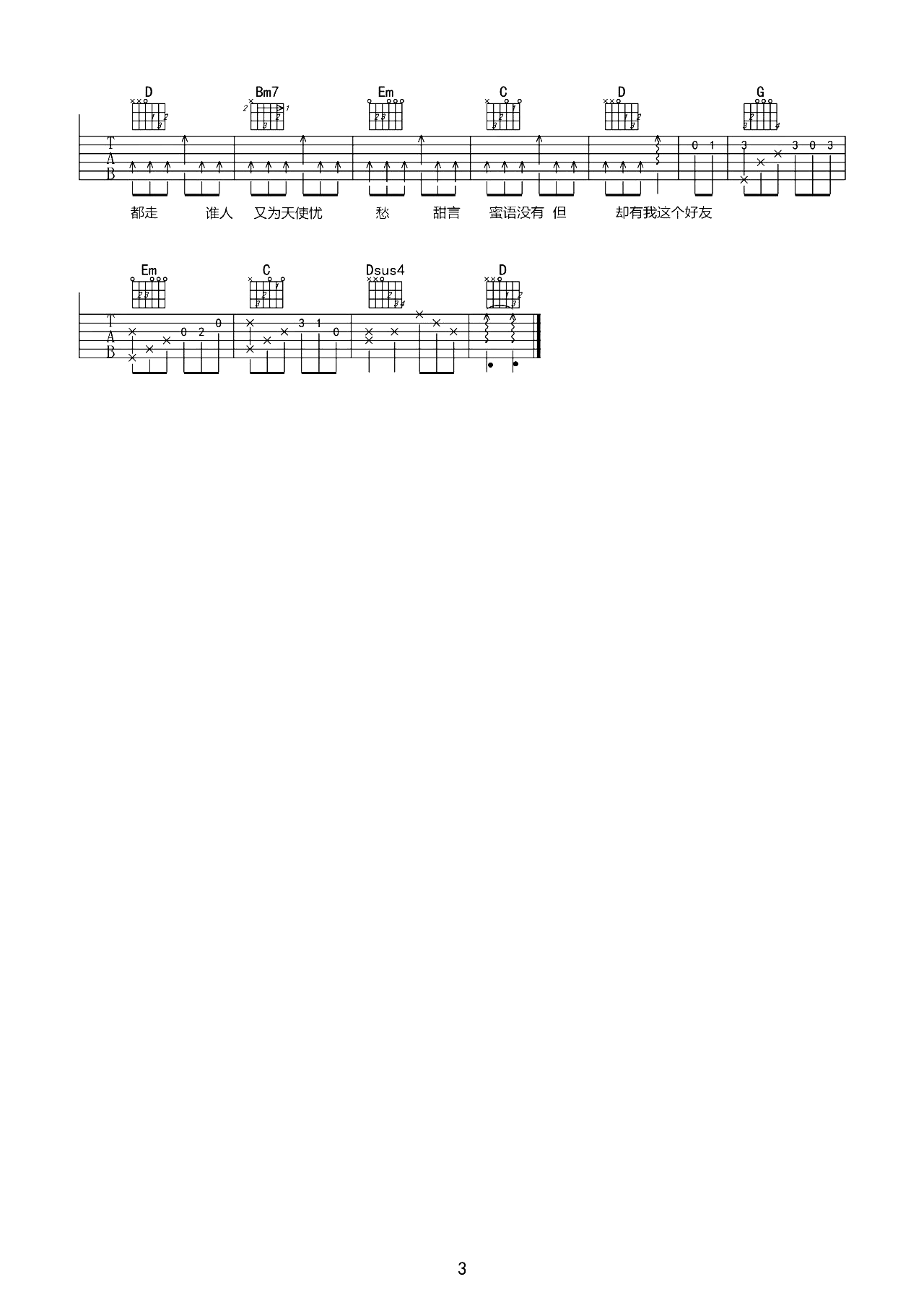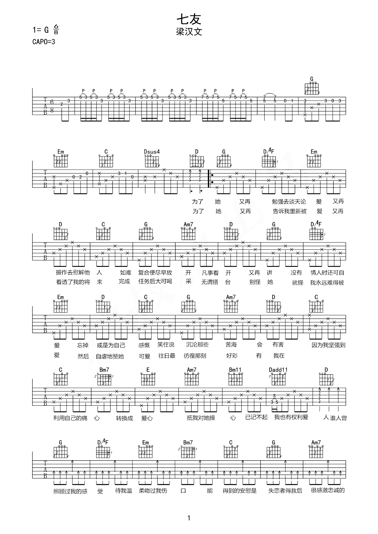曲谱介绍: 七友吉他谱,梁汉文演唱的粤语歌曲,被称之为男人的“备胎之歌”,在不懂得自爱的情况下,不断的转换自己的角色,将痛心转变为赋予对方的“爱心”,这首歌也诠释着男人深爱一个人的伤痛执着一面,耗尽心力却最终沦为“好友”角色。 《七友》吉他弹唱谱,按原版编配,含标准前奏,共三张高清PNG六线谱例,选用G调,节奏6/8拍,CAPO建议夹3品弹回原调B调。