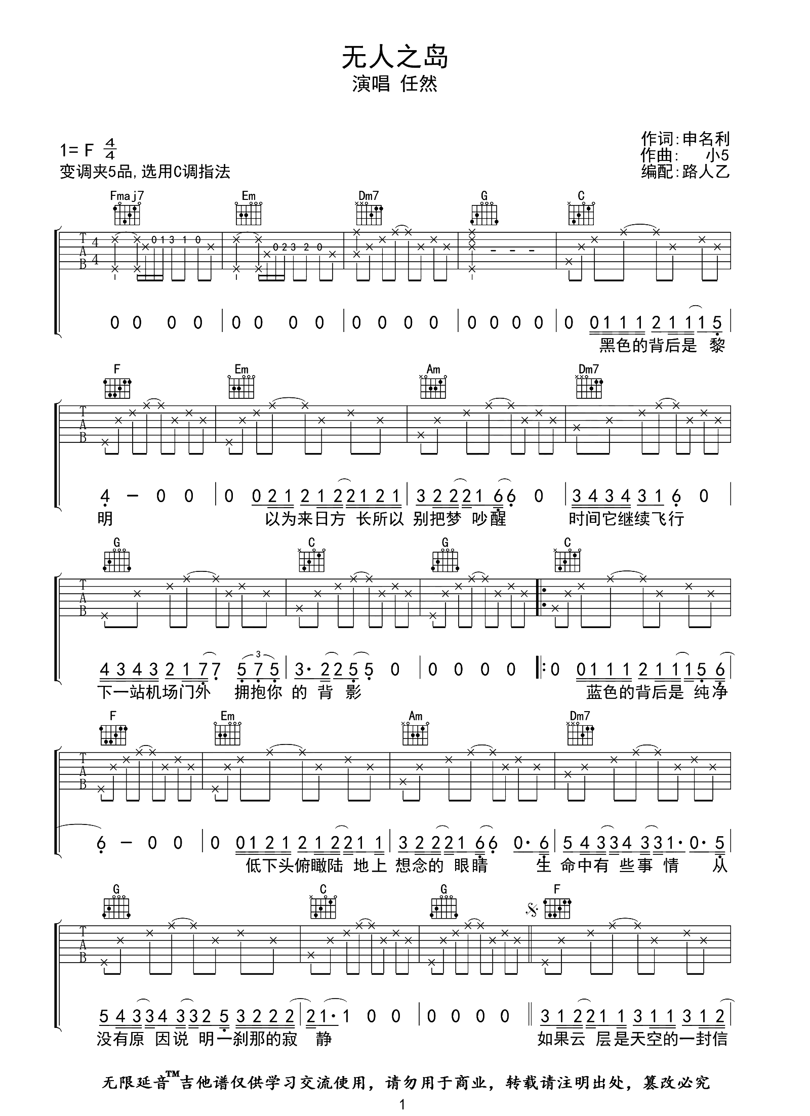 无人之岛吉他谱 - 任然 - C调吉他弹唱谱 - 原版