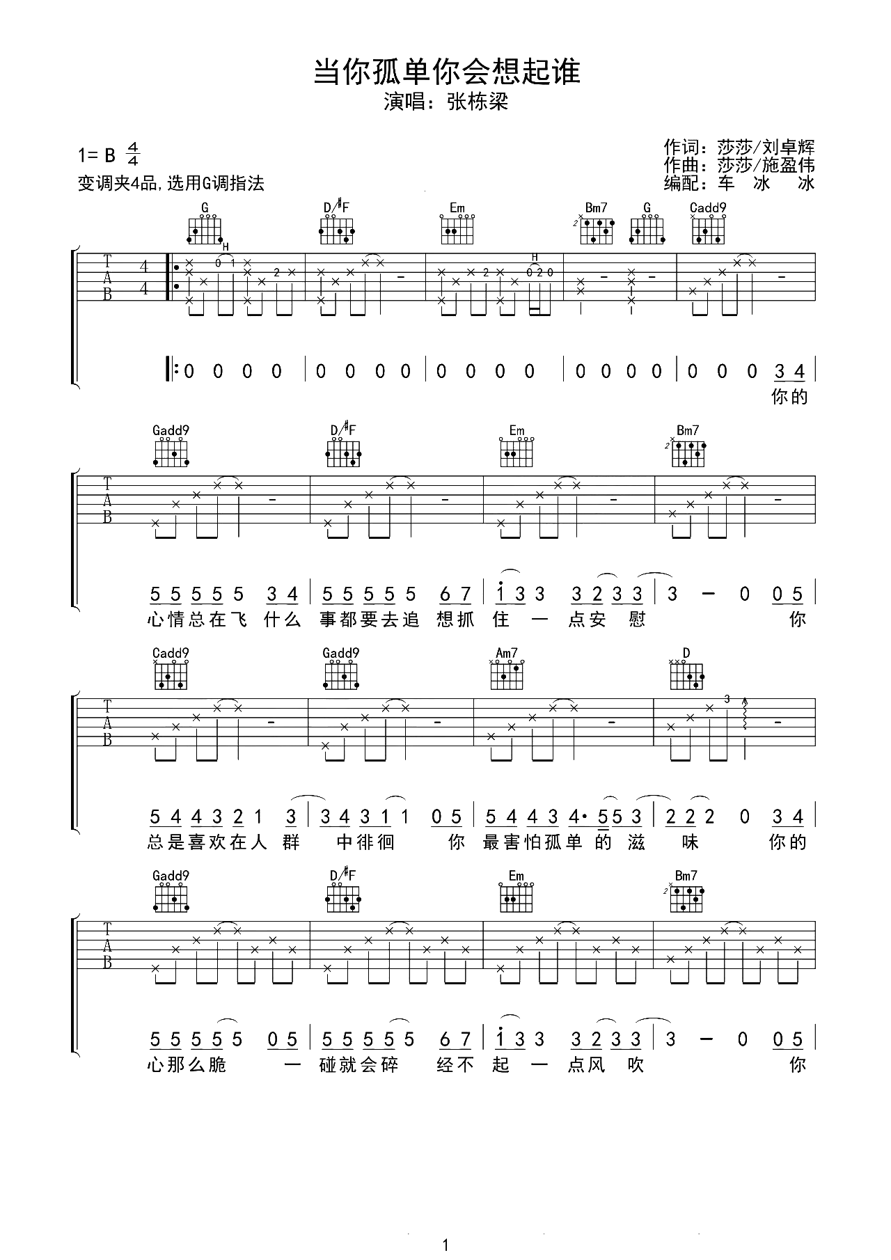 当你孤单你会想起谁吉他谱 - 张栋梁 - G调吉他弹唱谱 - 原版