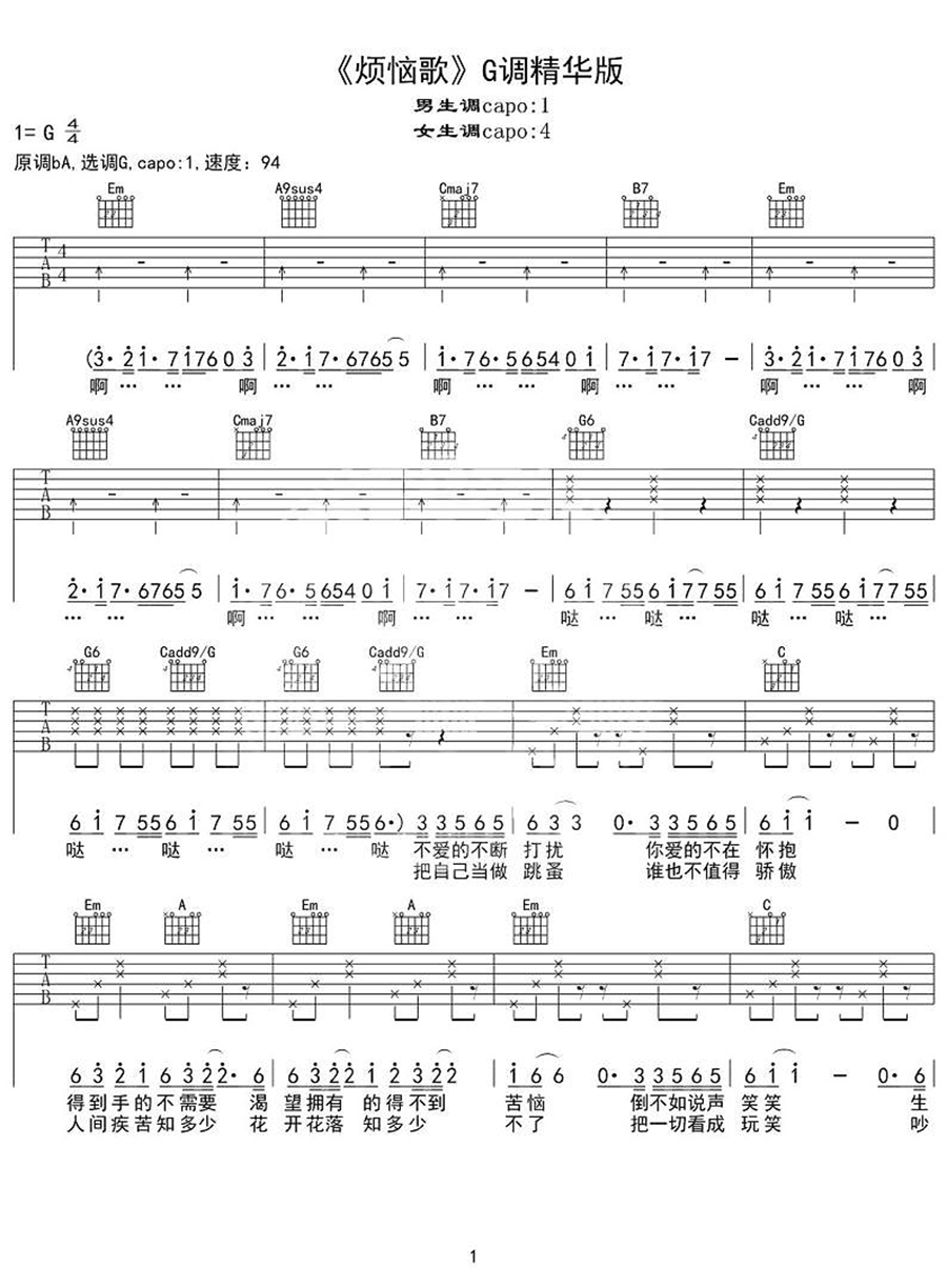 曲谱介绍: 烦恼歌吉他谱,张学友演唱,节奏律动感十足,仿佛用洒脱的节奏释怀烦恼,忘掉烦恼,没有什么事大不了,让我们用有限的时间,投入健康和快乐的怀抱! 《烦恼歌》吉他弹唱谱,共3张高清六线谱,选用G调指法,原调bA,这个版本为男女通用精华版,男生CAPO夹1品,女生夹4品,还原度70%,弹唱难度:2/5。