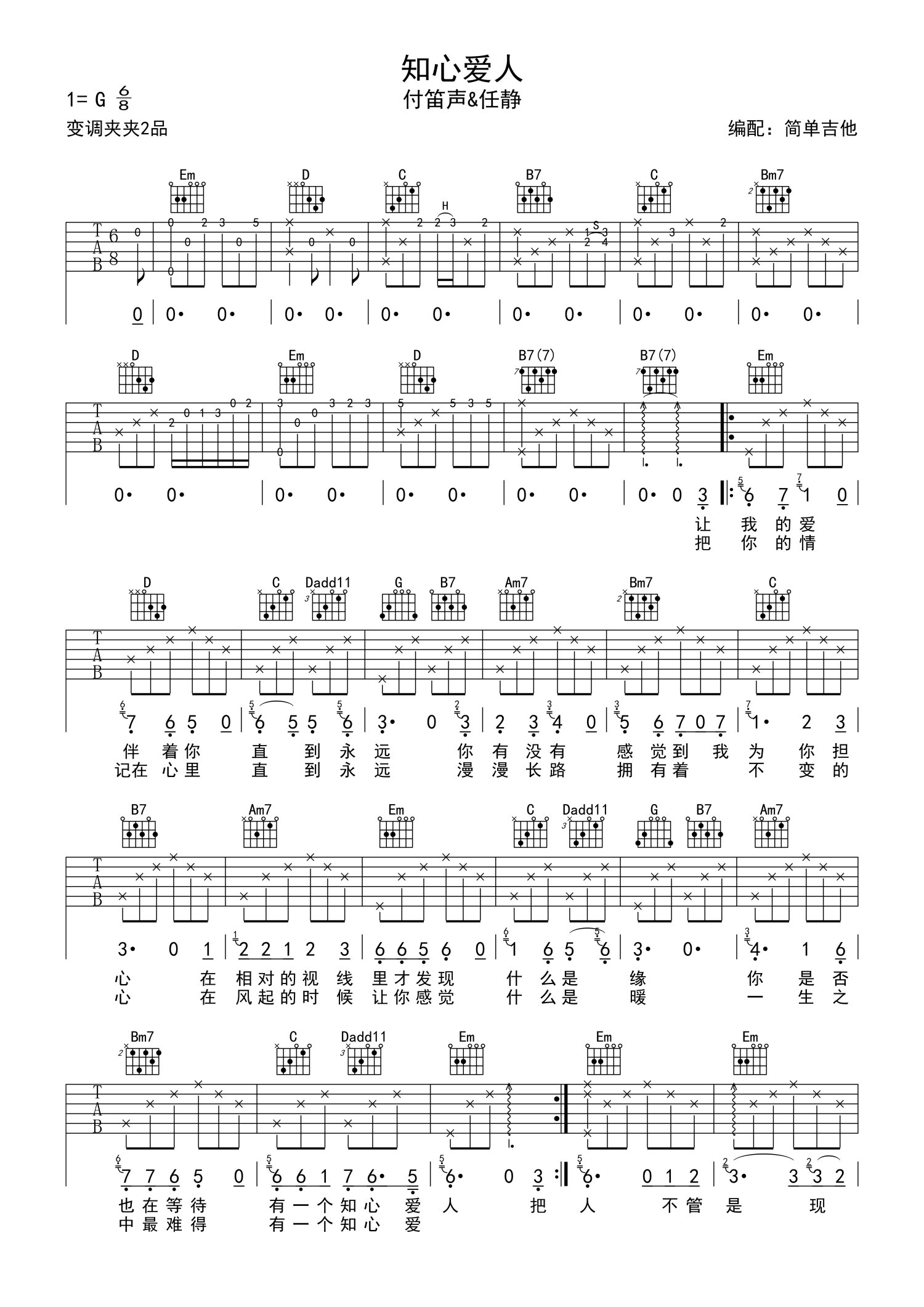 曲谱介绍: 付笛声&任静《知心爱人》吉他谱_G调吉他弹唱谱