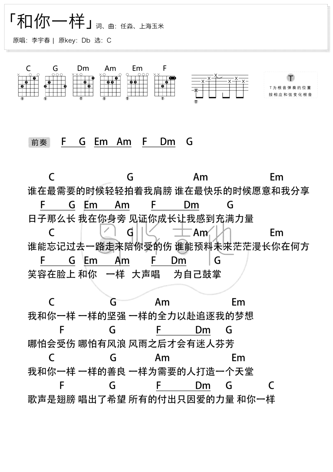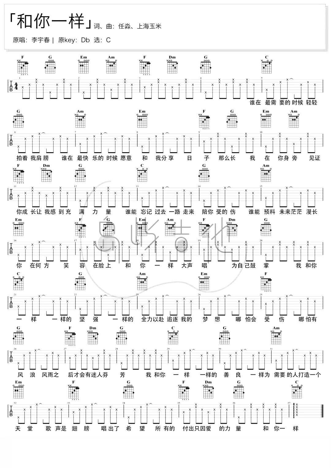 曲谱介绍: 和你一样吉他谱,李宇春演唱的励志暖心歌曲,这首旋律在短视频中十分的火热,就如同歌词所述一样“我和你一样,一样的坚强.”,用感同身受传递着梦想与正能量,让我们感到了无比的温暖,以及对未来无穷的信仰! 《和你一样》吉他弹唱谱,选用C调指法,原调bD,CAPO夹1品可弹回原调,本谱共有1张六线谱+1张和弦谱,比较适合新手弹唱,原版比例:80%,难度:1级。
