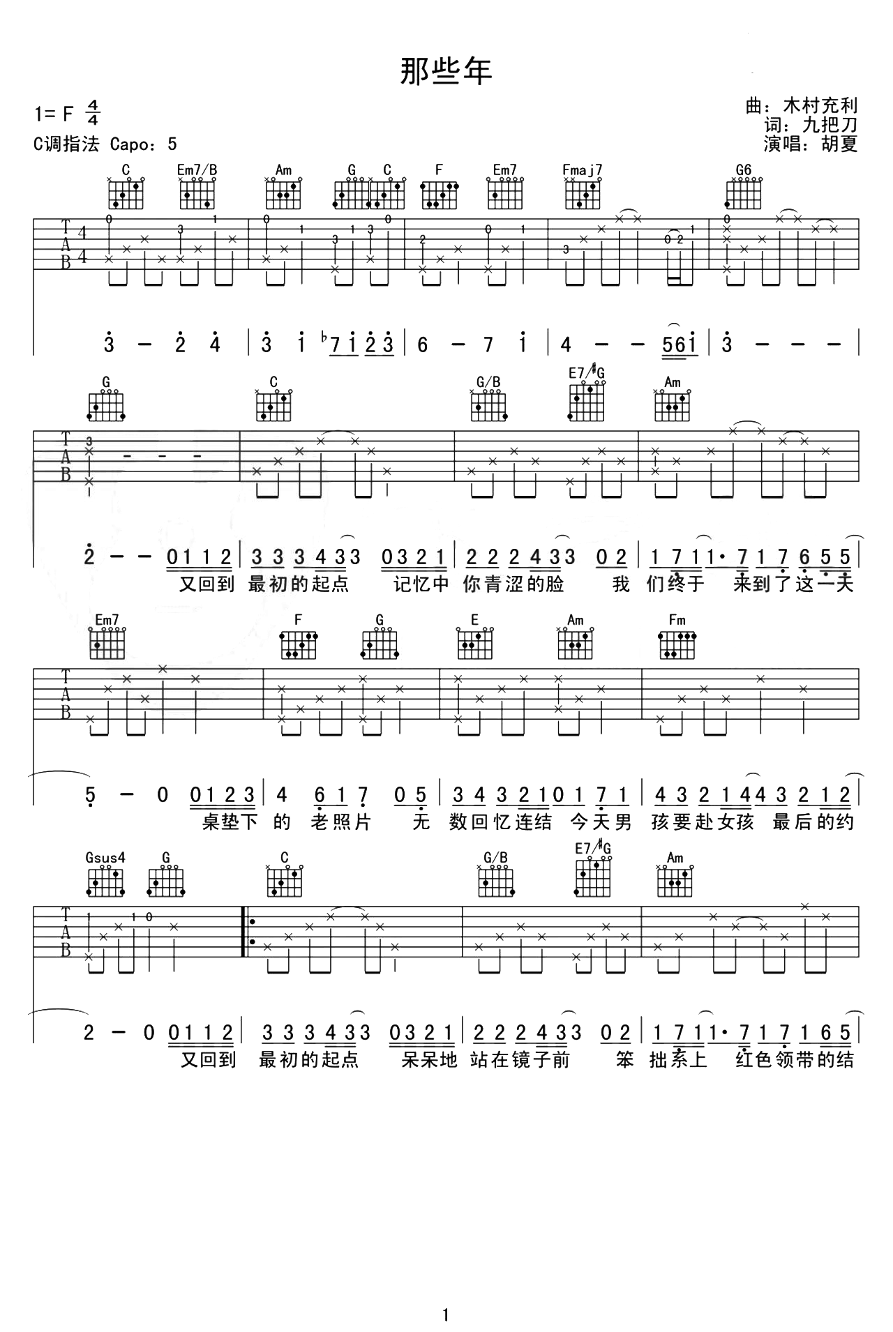 曲谱介绍: 那些年吉他谱,胡夏演唱的青春歌曲,电影《那些年,我们一起追的女孩》主题曲,我们的青春总在茫然中失去且遗憾,在追忆中去想念“那些年”,那是无法回到的过去,但那些触动人心的画面,哪怕时隔再久,每当想起总会那么的记忆犹新。 《那些年》吉他弹唱谱,选用C调指法,原调F调,CAPO夹5品可以弹唱原调,本谱含完整的前奏,超原版编配,还原度:90%,难度2/5,E7/#G和弦的指跨度,对于新手略有难度,多练张力即可。