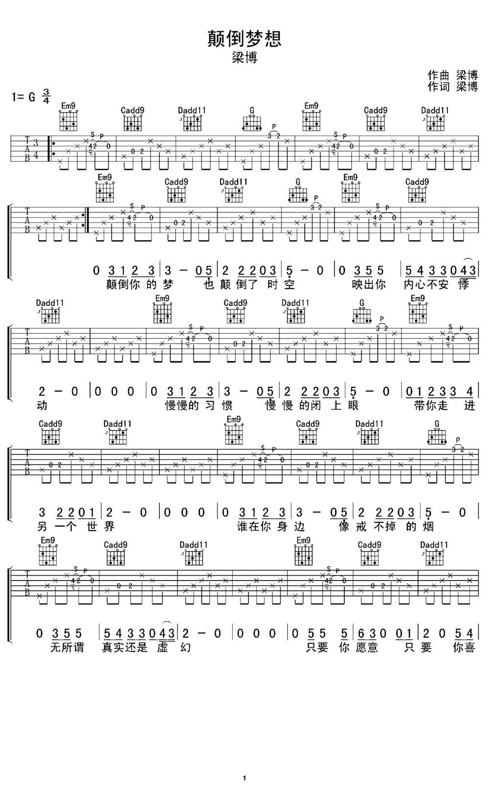 颠倒梦想吉他谱 - 梁博 - G调吉他弹唱谱 - 原版