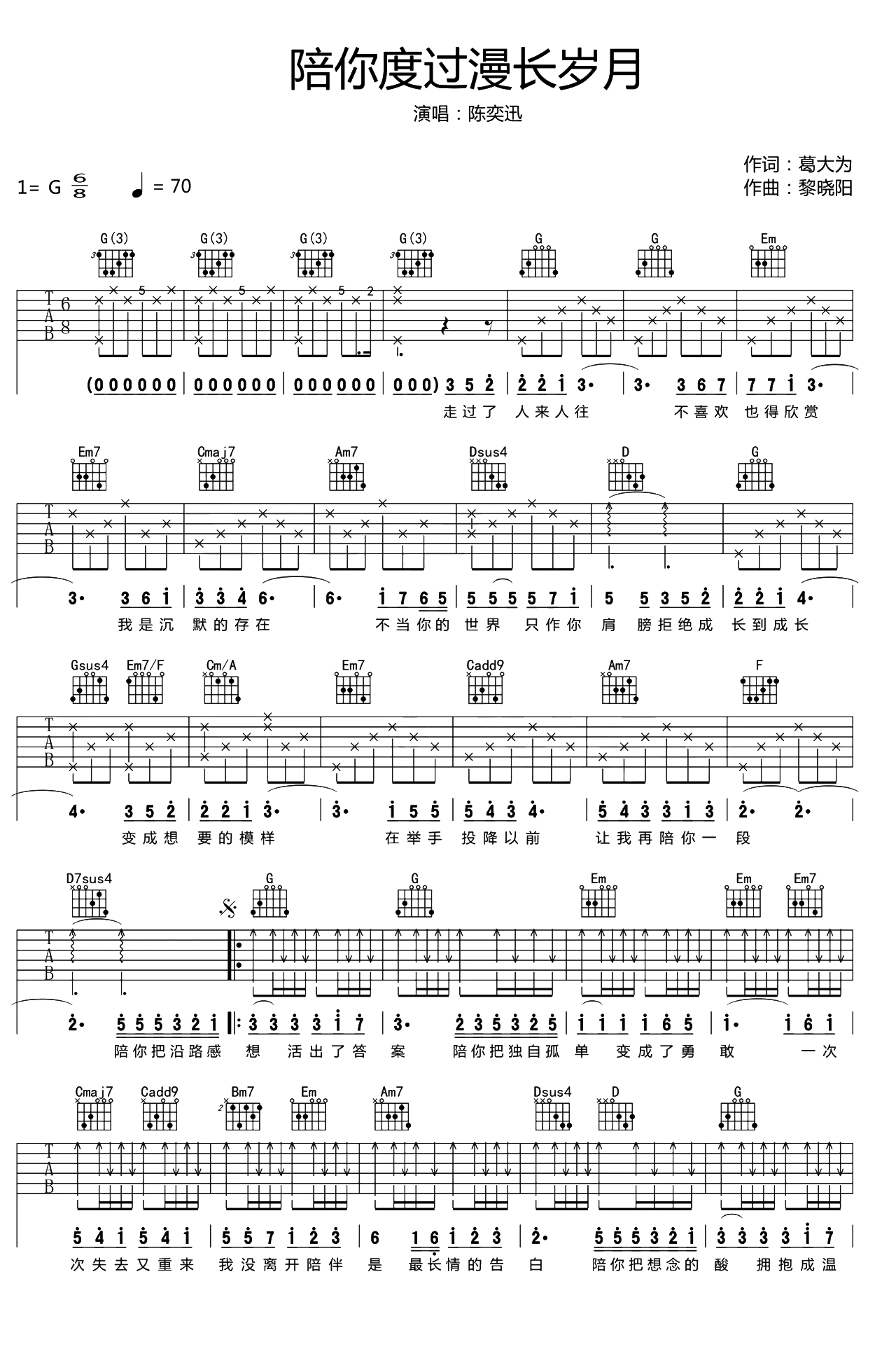 陪你度过漫长岁月吉他谱 - 陈奕迅 - G调吉他弹唱谱 - 原版