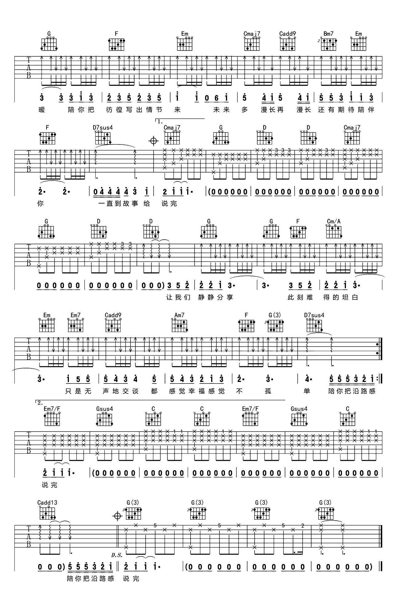 曲谱介绍: 陪你度过漫长岁月吉他谱,陈奕迅演唱,电影《陪安东尼度过漫长岁月》的主题曲,舒适的旋律节奏,充满质感的演唱方式,细腻而又贴心,将“陪伴”演绎到故事说完,也正好拉满了我们生活中想要长情陪伴的共鸣。 《陪你度过漫长岁月》吉他弹唱谱,选用G调指法,标准调音无需使用变调夹,节奏6/8拍,速度控制在70拍每分钟,本谱共2张高清PNG纯净吉他六线谱,还原度:85%,难度:2/5。