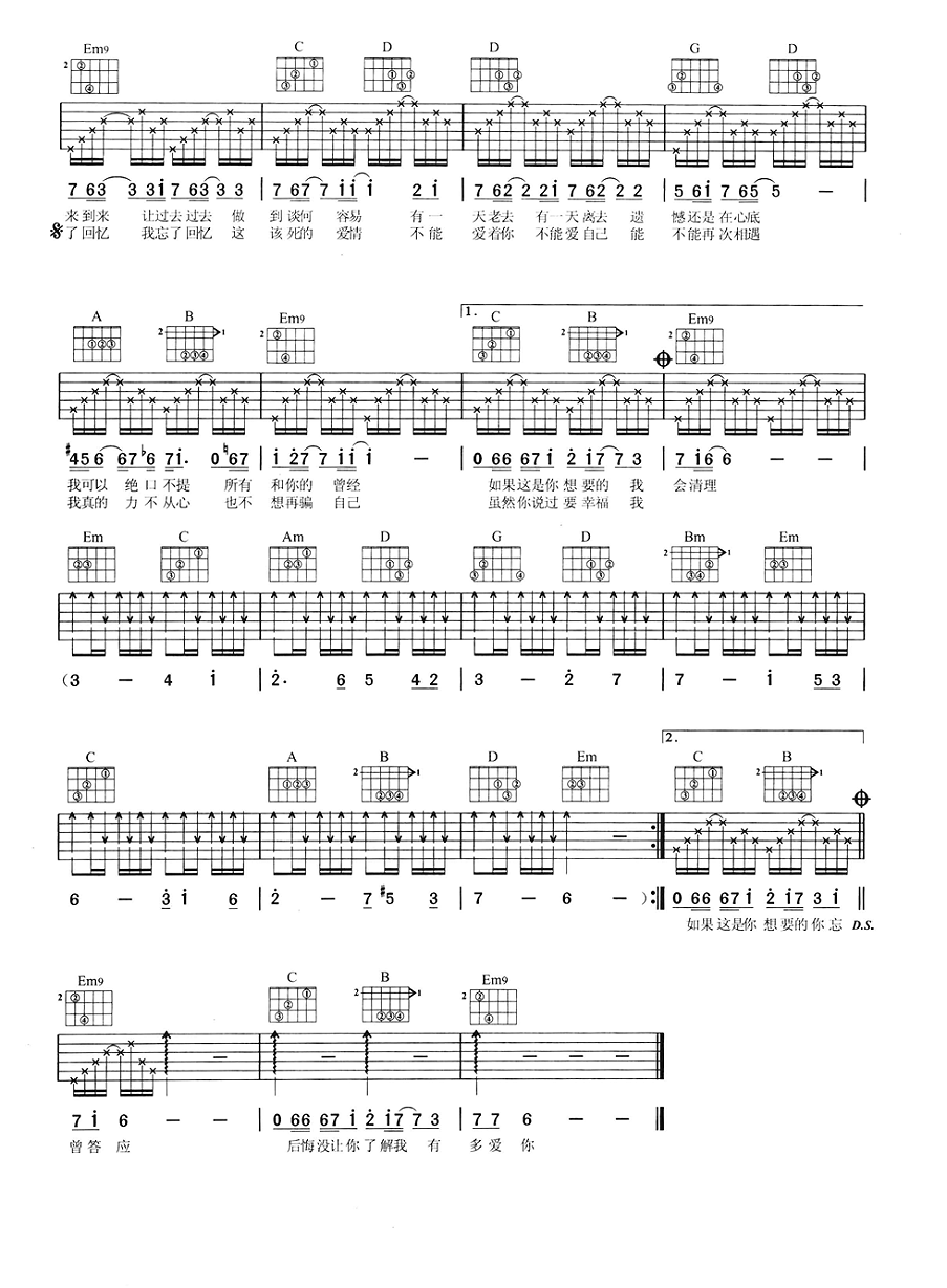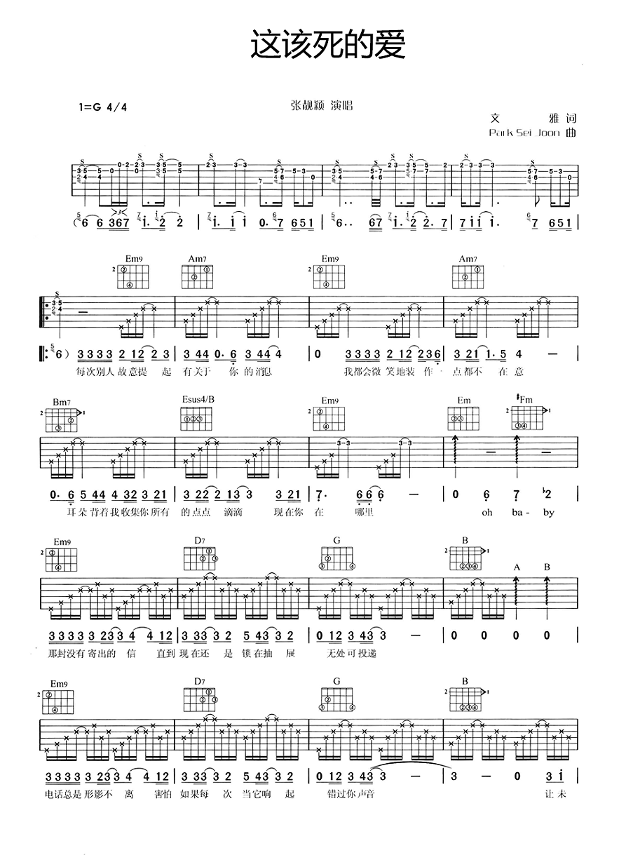 曲谱介绍: 这该死的爱吉他谱,张靓颖演唱,丰富的层次感将不堪的爱情诠释的淋漓尽致,那些逝去的爱情如故事一般再次呈现,未来终将会来,过去也不会再出现,不要再去怀缅“死去”的爱情。 《这该死的爱》吉他弹唱谱,选用G调指法,标准调音,女生弹唱无需再使用变调夹,本谱共有2张高清PNG吉他六线谱图例,还原度:85%,难度:4级。