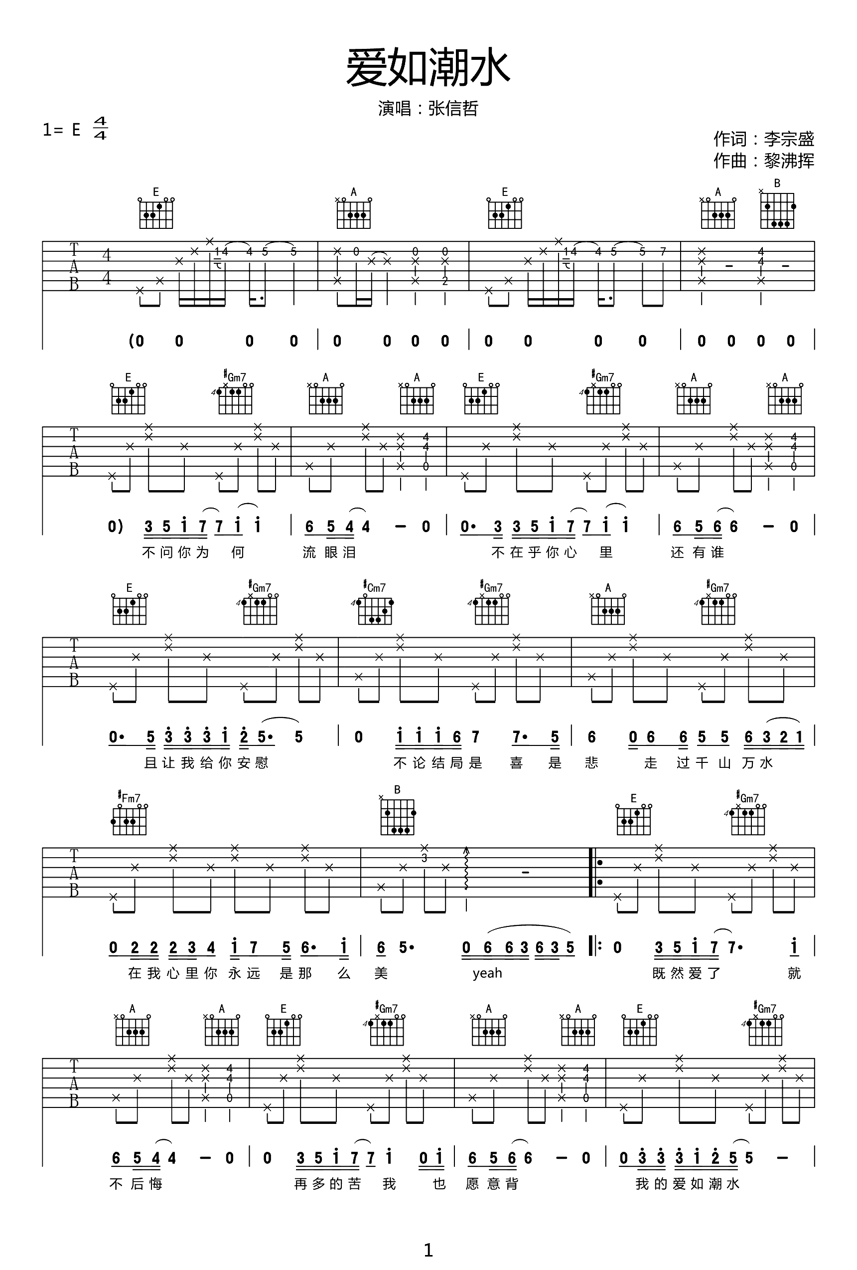 爱如潮水吉他谱 - 张信哲 - E调吉他弹唱谱 - 原版