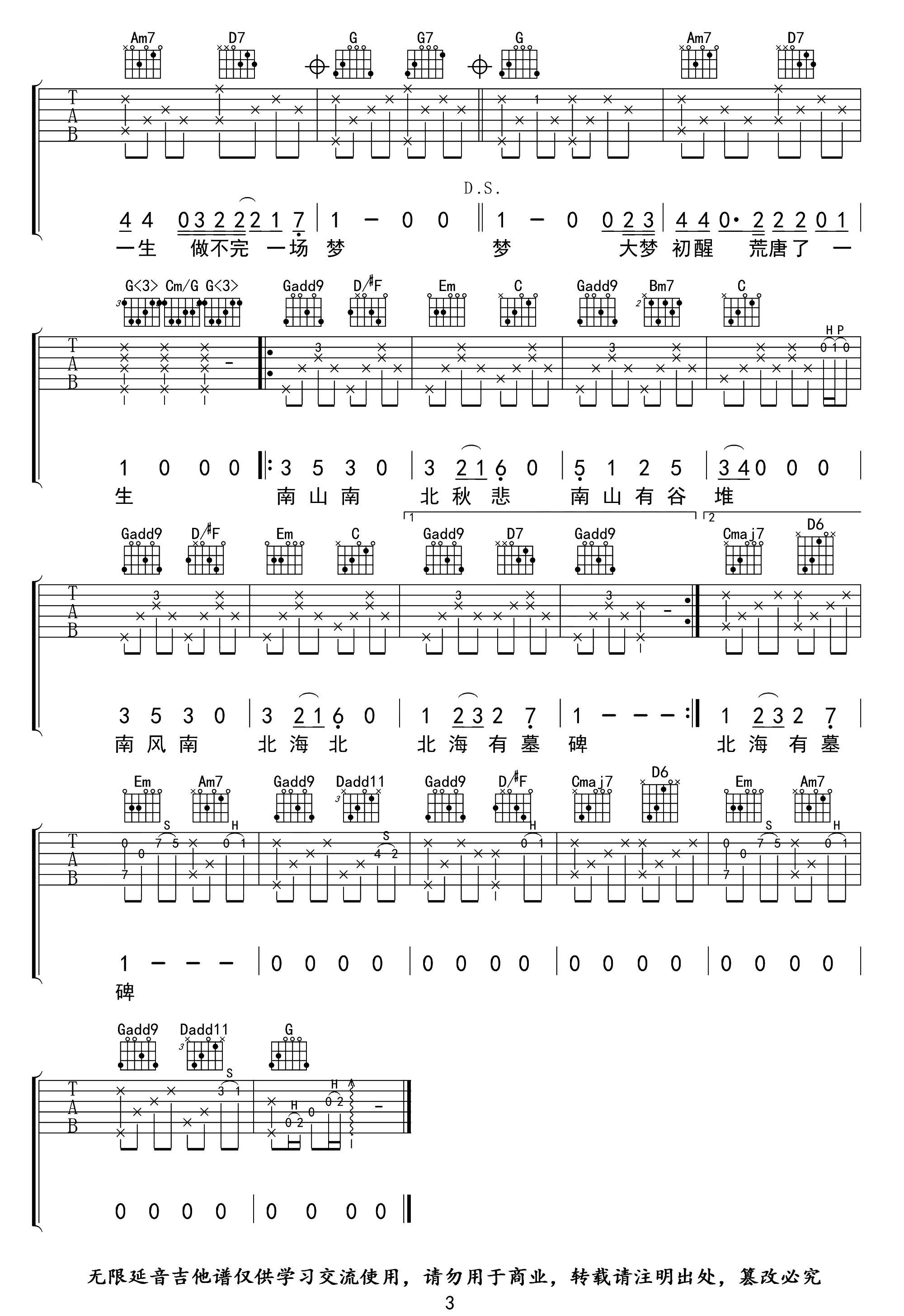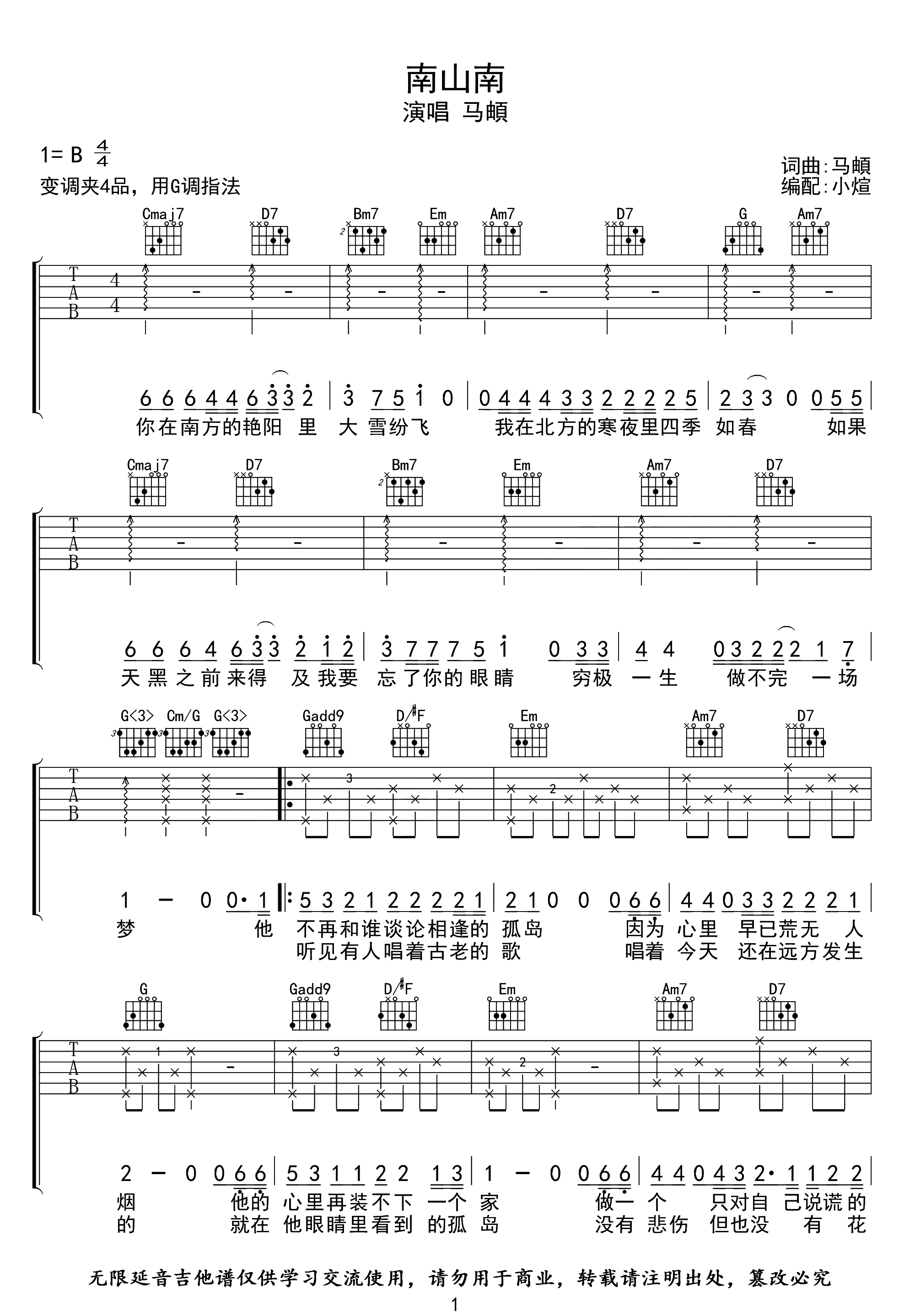 曲谱介绍: 南山南吉他谱,马頔原唱的民谣歌曲,舒缓之中带着悲凉的伤感情绪,那就是你听到这歌的时候,它就已经与我无关了,你掉的泪水,才是仅有你自己知晓的故事。 《南山南》吉他弹唱谱,选用G调指法,原调B调,CAPO夹4品弹唱原调,共3张高清PNG图片谱例,还原度:85%,难度1/5,张磊的版本深入人心,马頔的版本才有最初的韵味。
