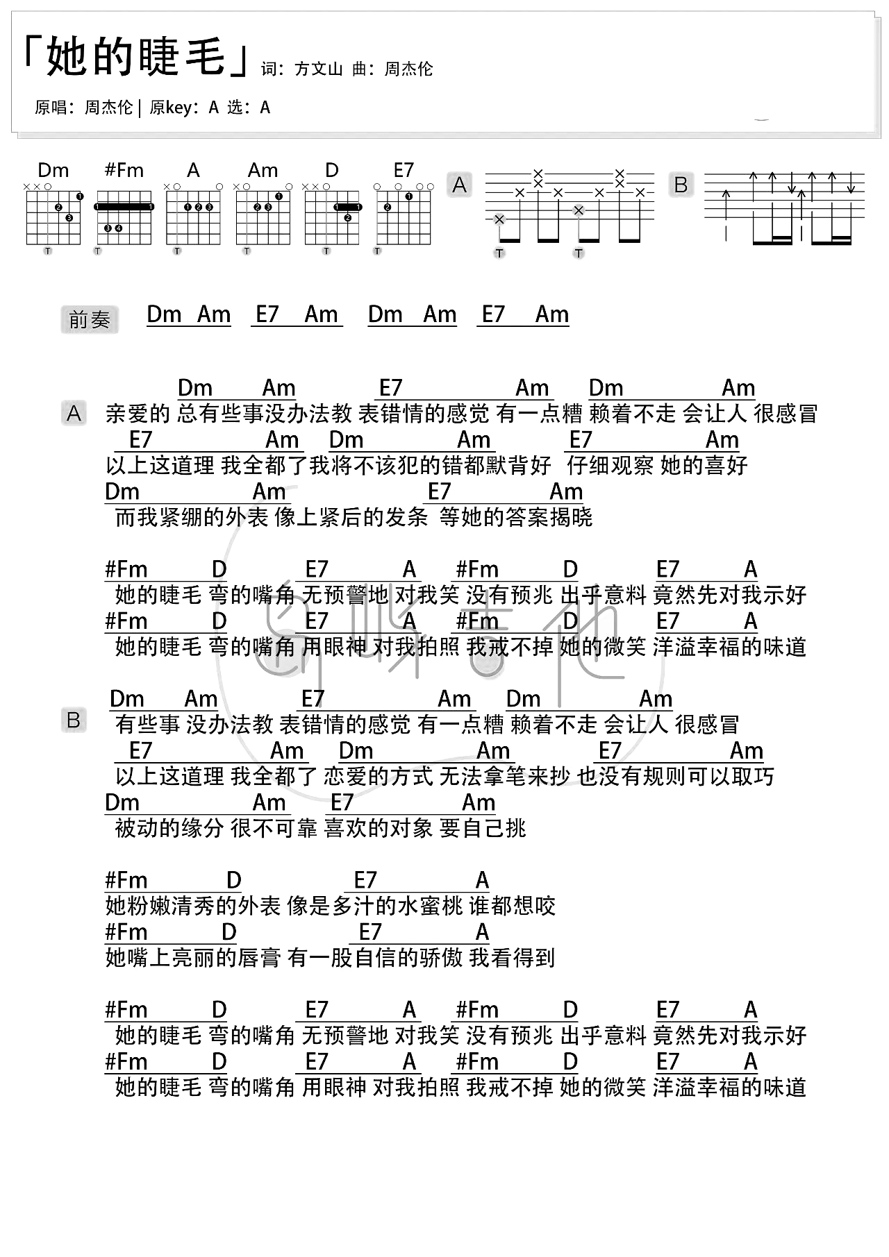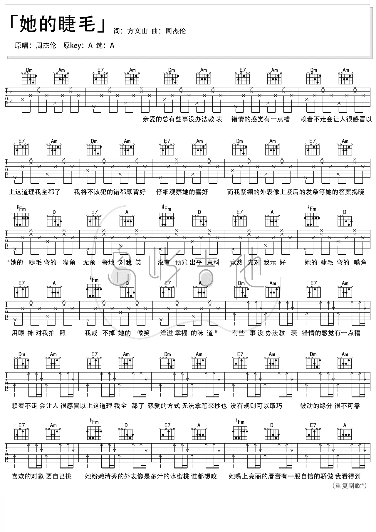 她的睫毛吉他谱 - 周杰伦 - A调吉他弹唱谱