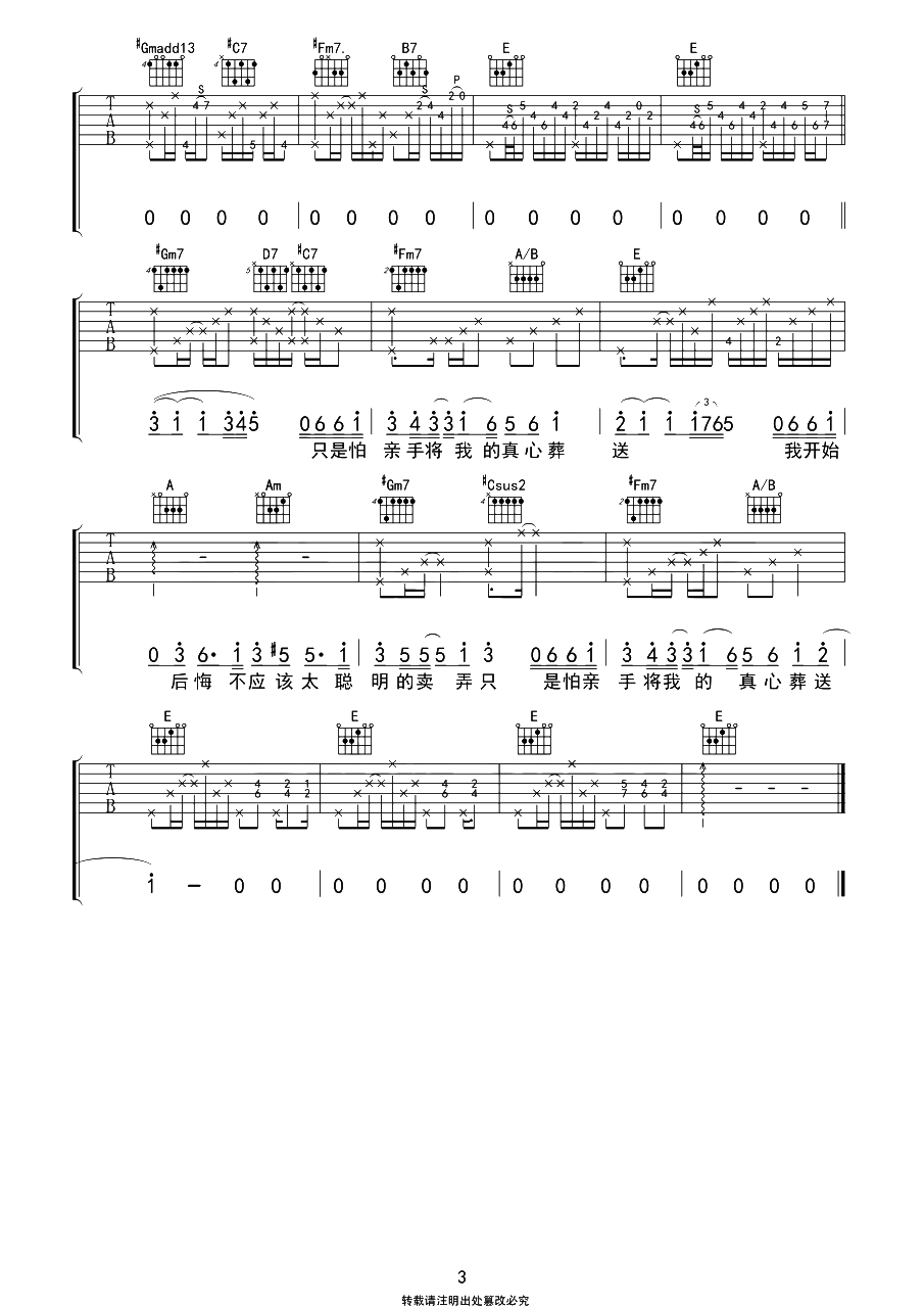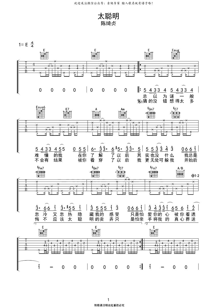 曲谱介绍: 太聪明吉他谱,陈绮贞演唱的歌曲,爱情里的博弈往往输在了“太聪明”,赢来了唐突的过程,却输掉了结局,这首歌以女生的第一视角诠释着我们在爱情里的自作聪明,很多时候不敢笃定,但却偏偏要笃定后再猜忌。 《太聪明》吉他弹唱谱,选用E调指法,标准调音无需使用变调夹,按原版编配,共3张高清PNG吉他六线谱图例,还原度:85%,难度:4级,本谱由琴谱网整理上传。